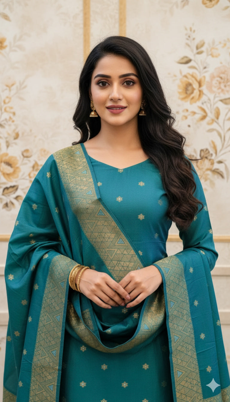 Product Details Top : Banarasi | 2.5 Meter Bottom : Santoon | 2 Meter Dupatta...