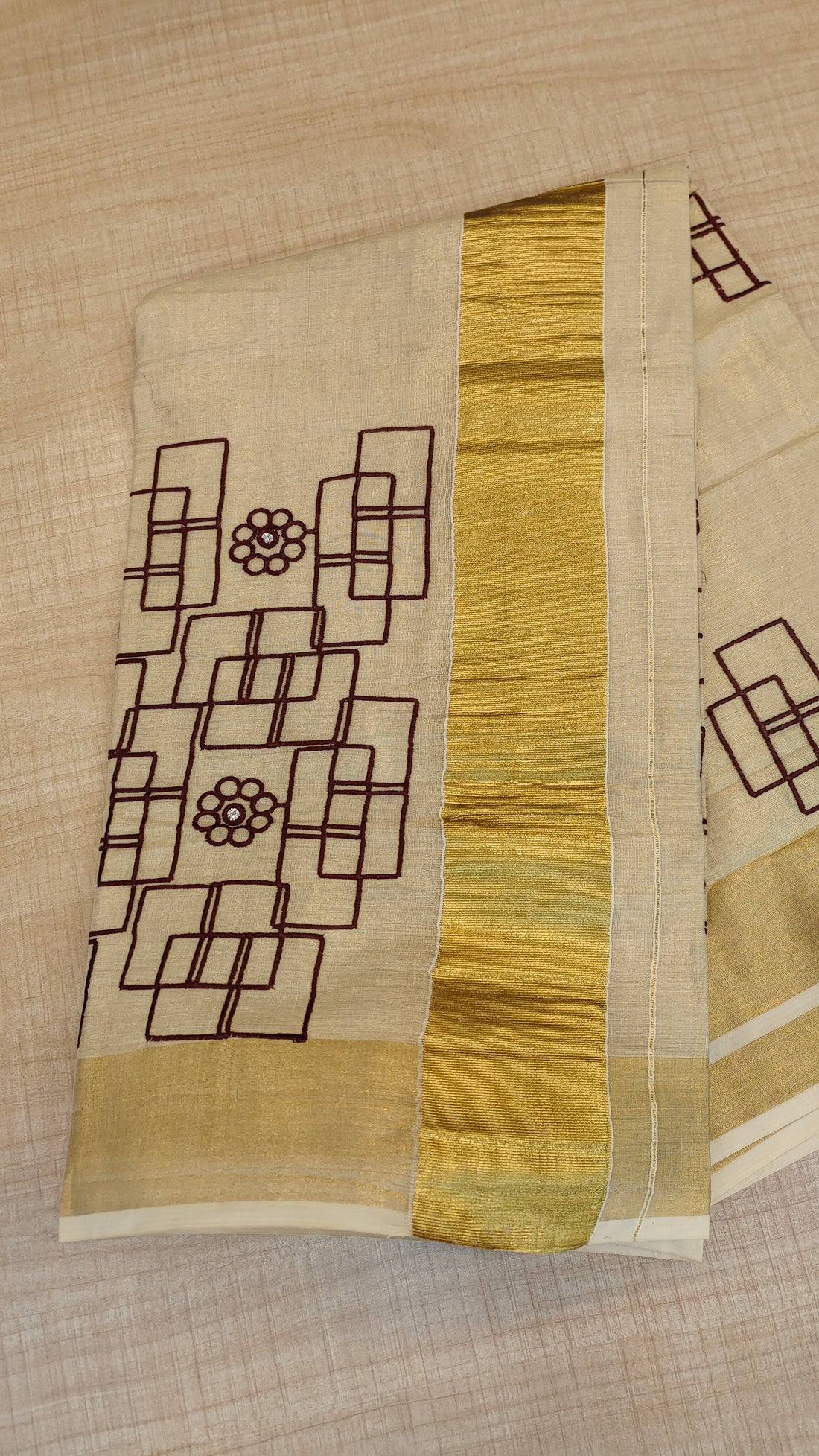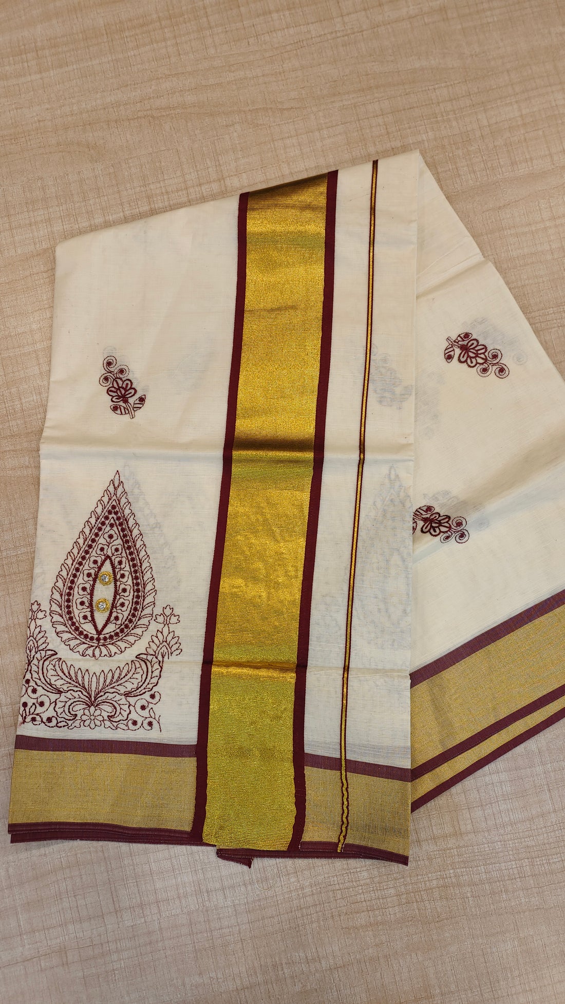 Cotton Kerala Saree with embroidery in temple design.