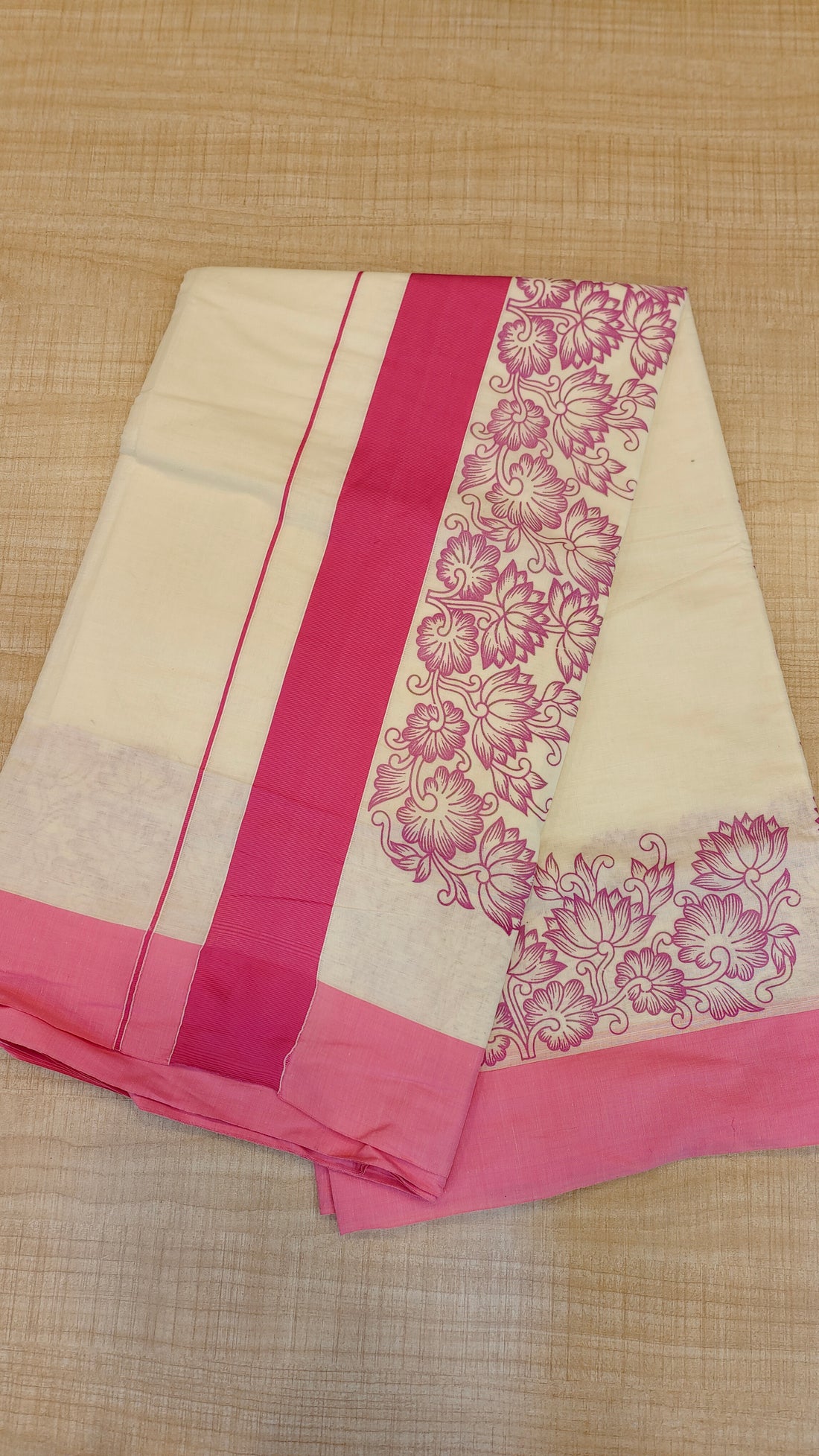 Cotton kerala saree with lotus floral print. Same running blouse attached with saree Miya paired...
