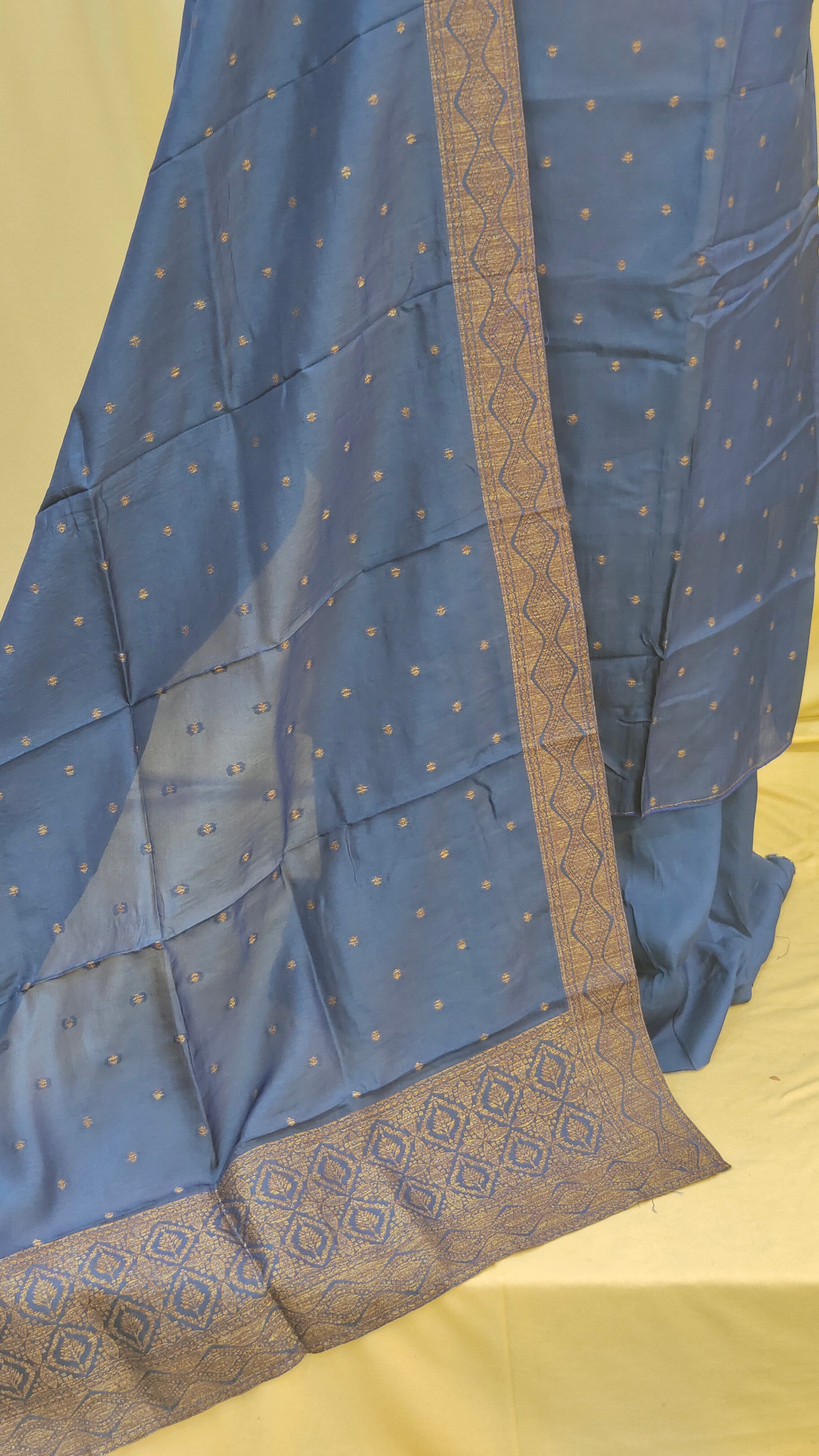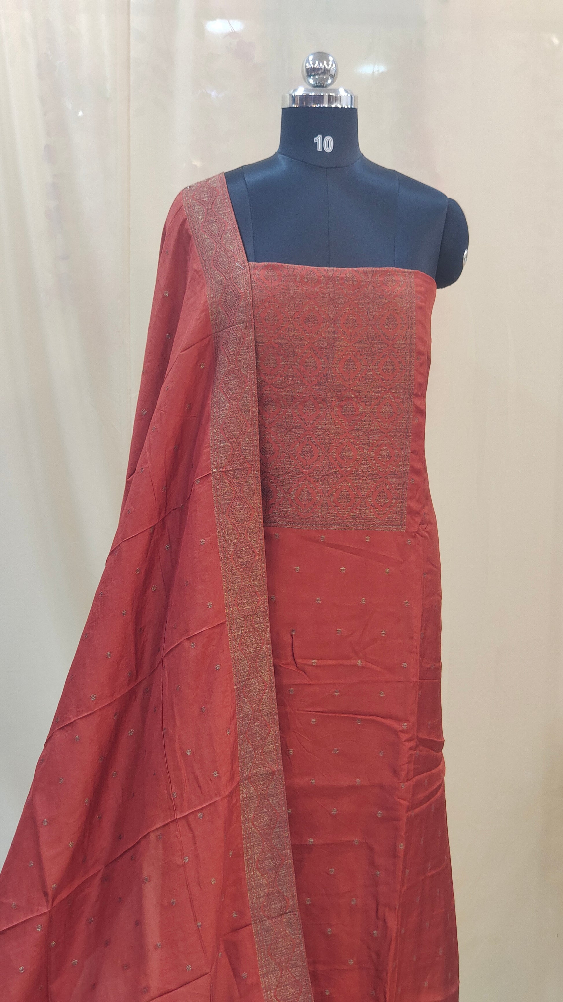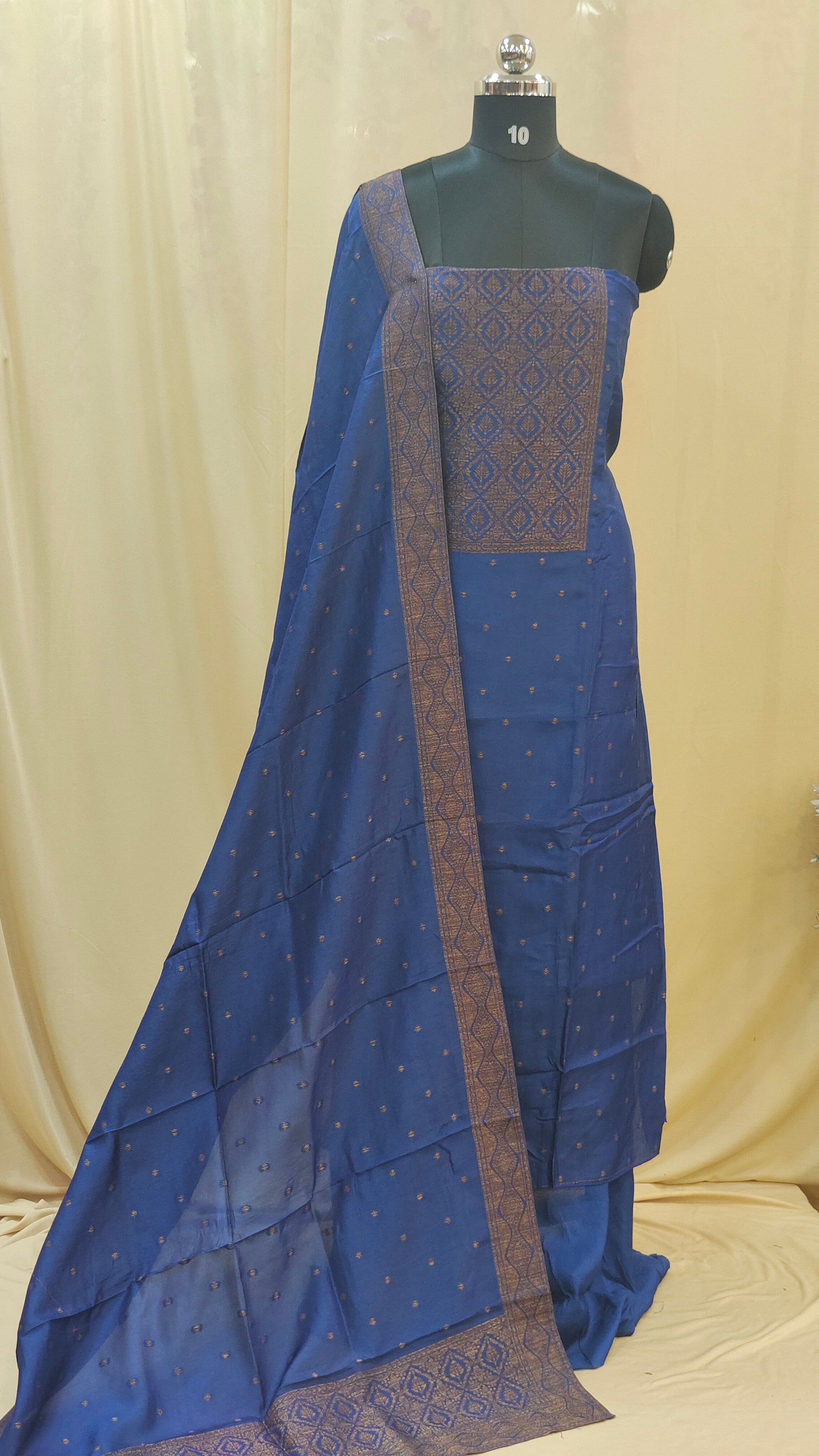 Fabric : Crafted in rich banarasi fabric featuring copper motifs all over the body portion that exude a royal touch.