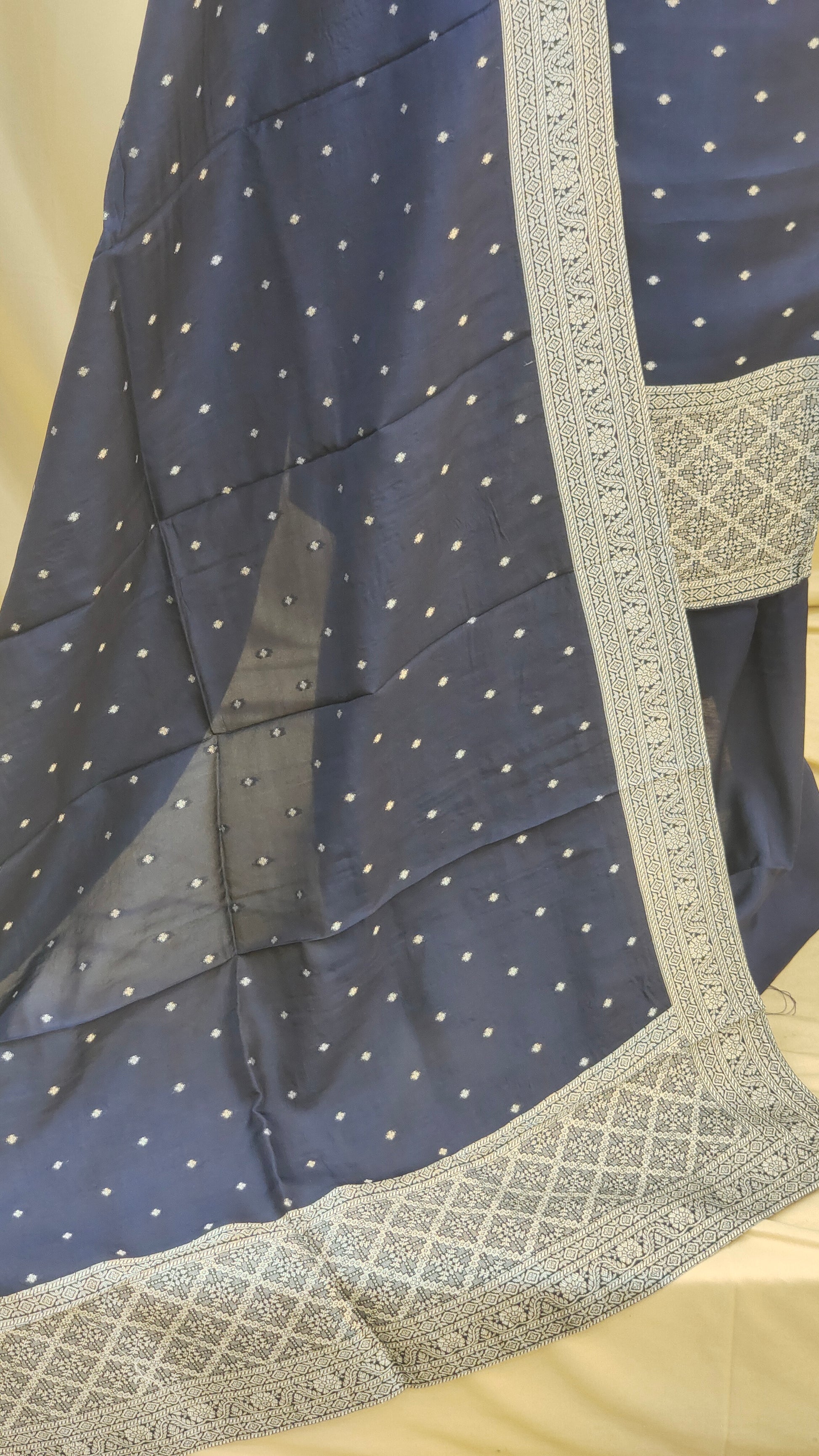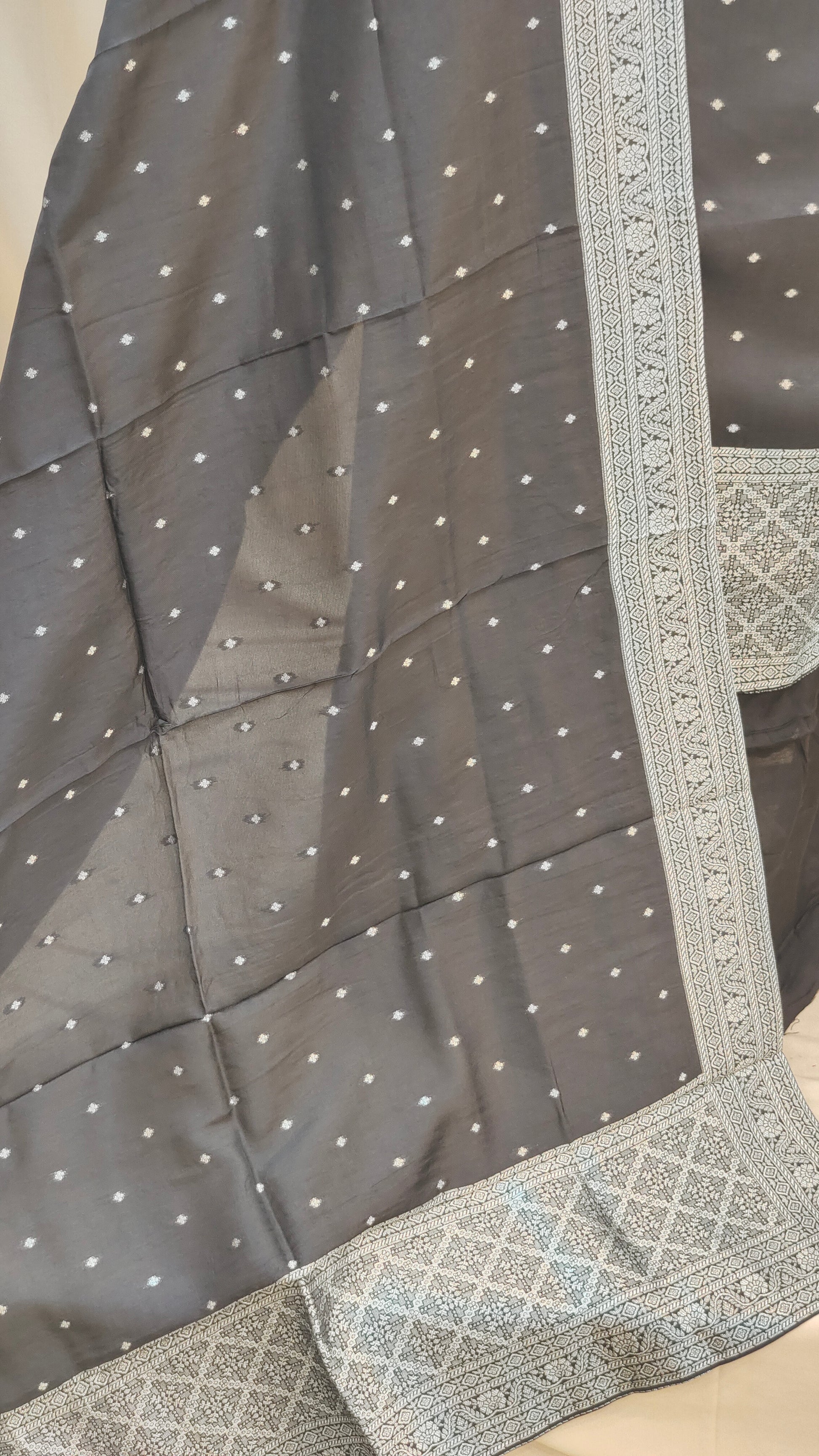 Fabric : Crafted in rich banarasi fabric featuring silver motifs all over the body portion that exude a royal touch.