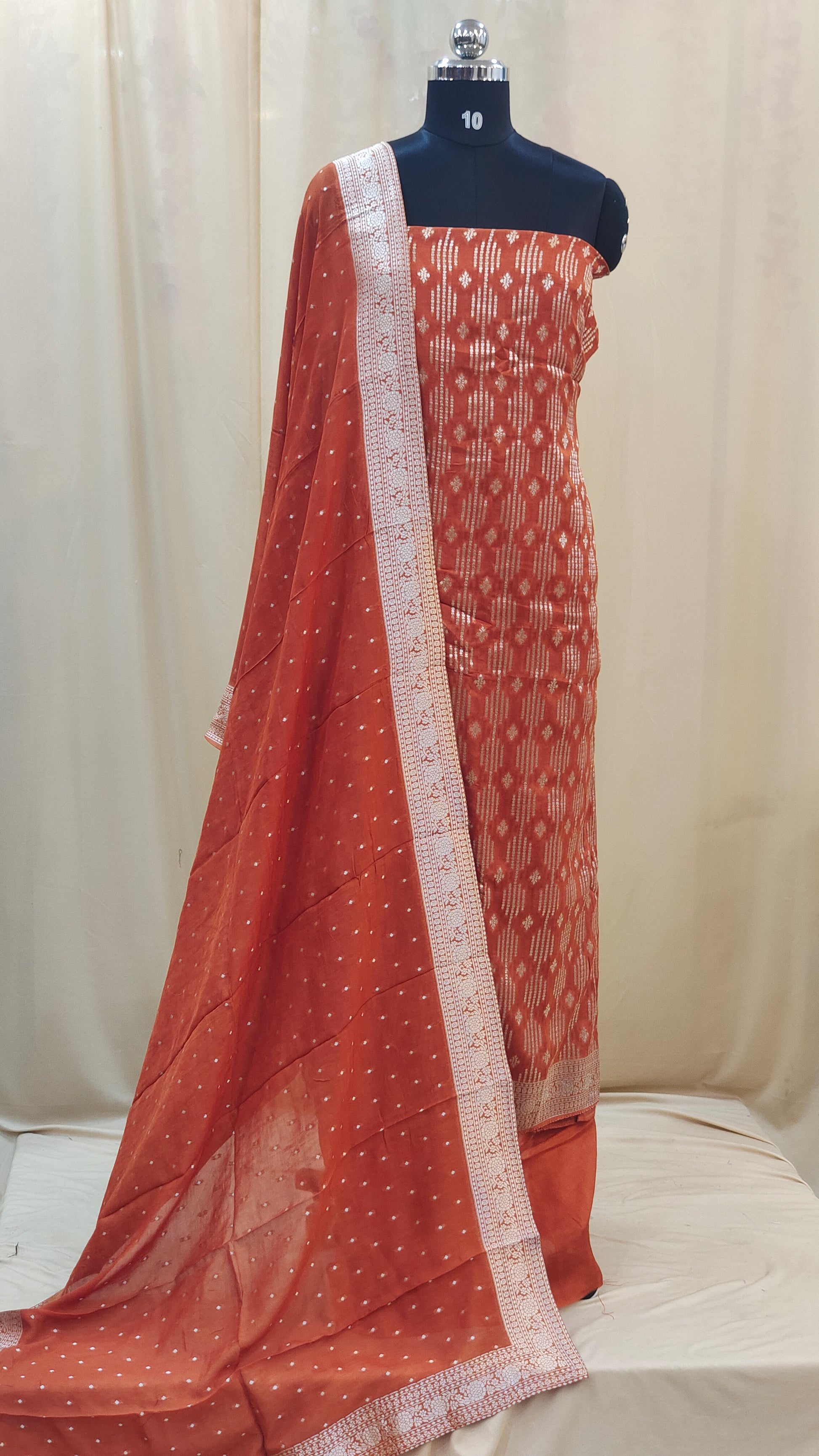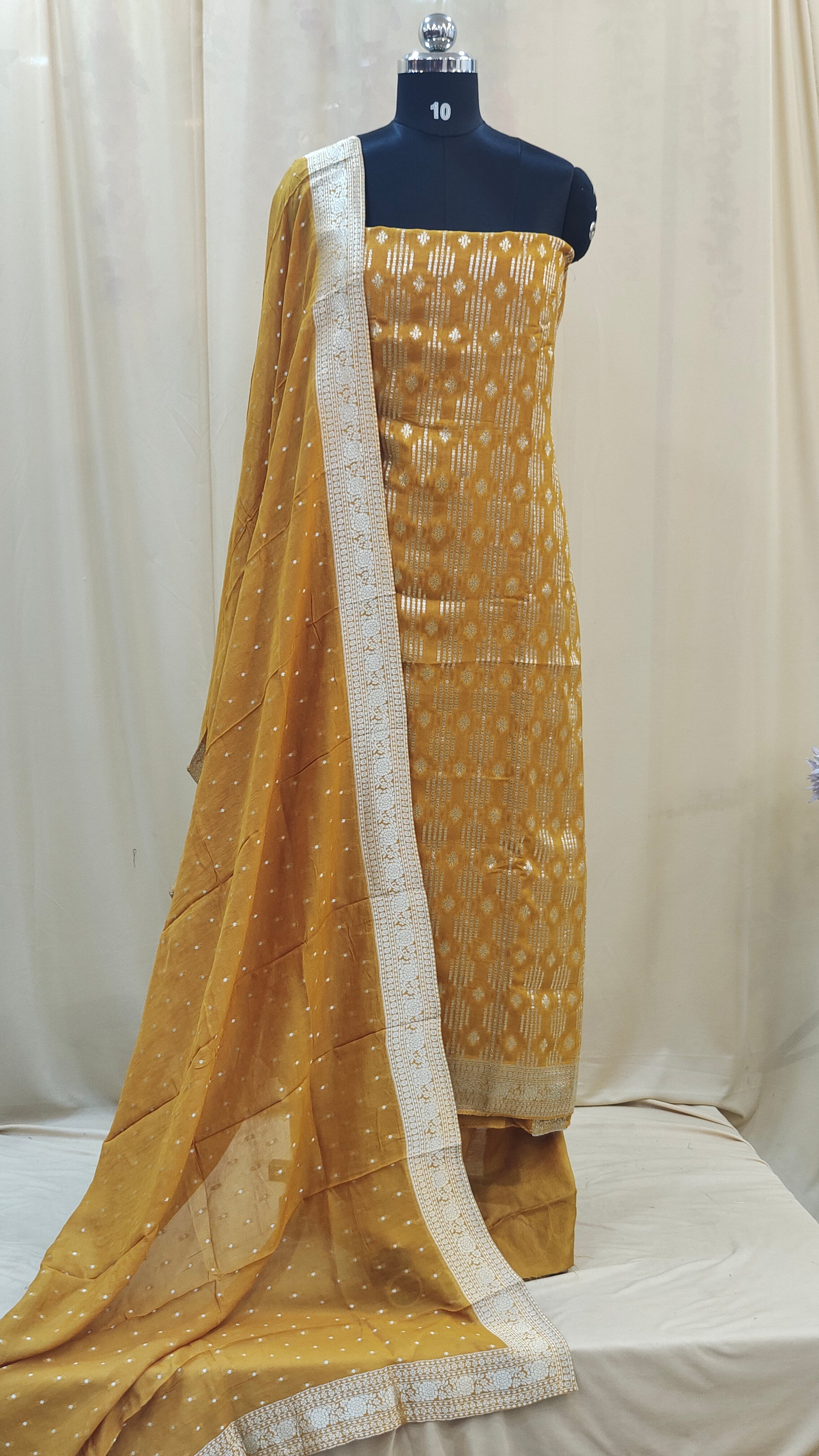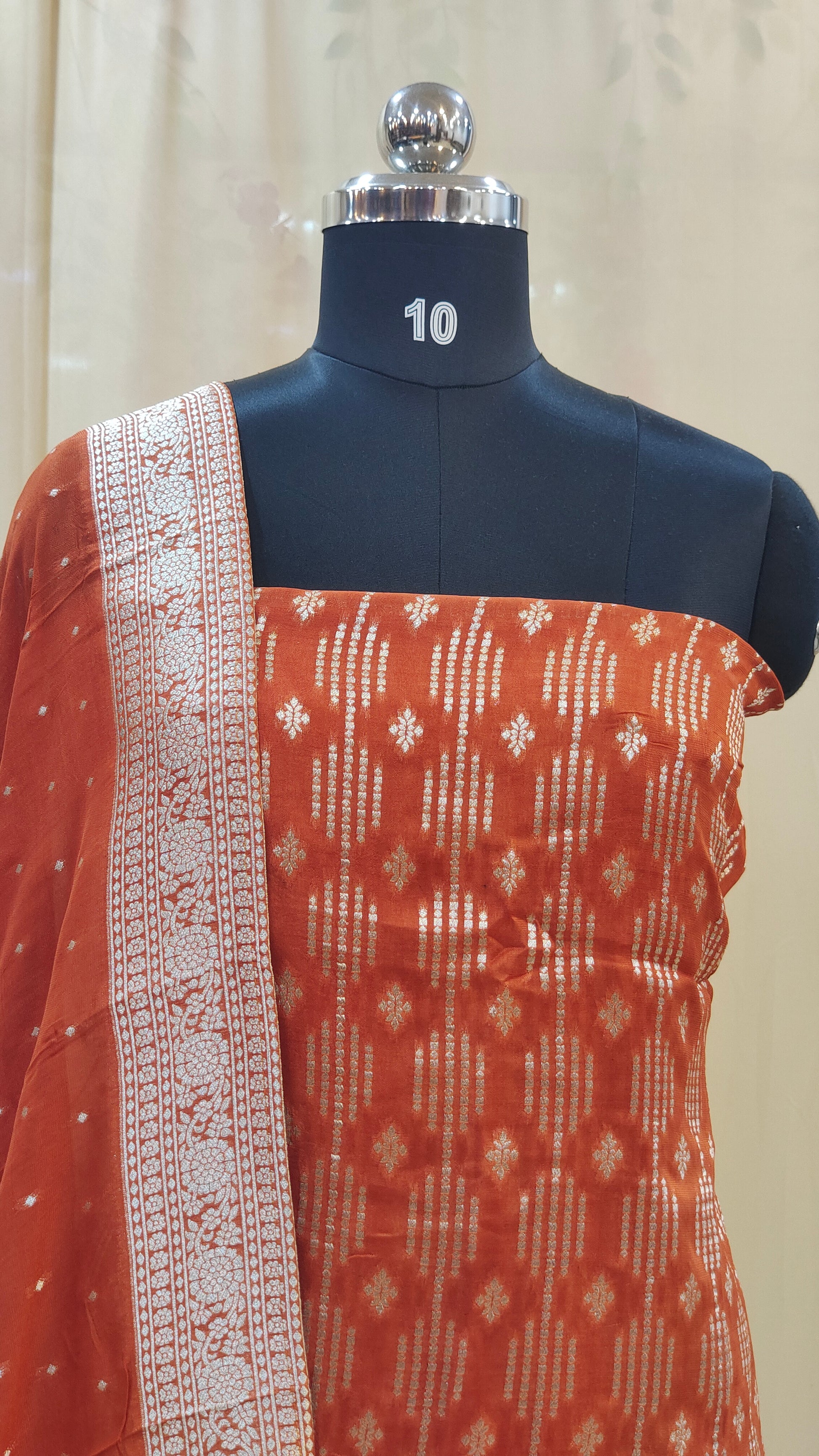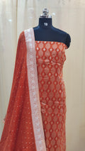Dupatta : Paired with a banarasi dupatta adding a soft and graceful contrast to the shimmering banarasi top.