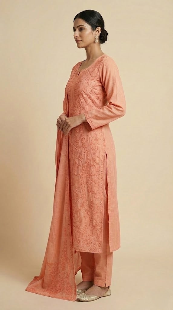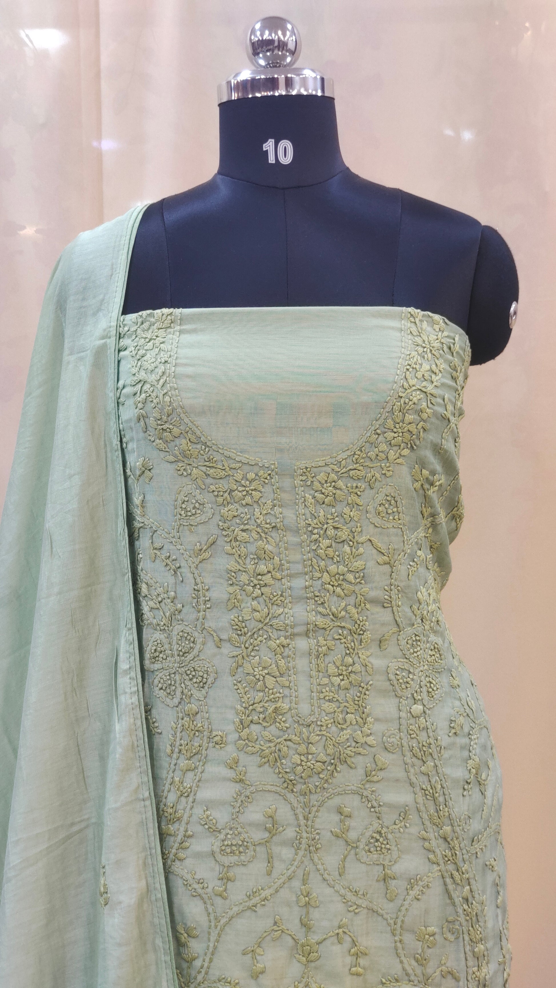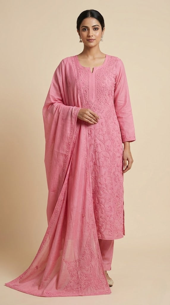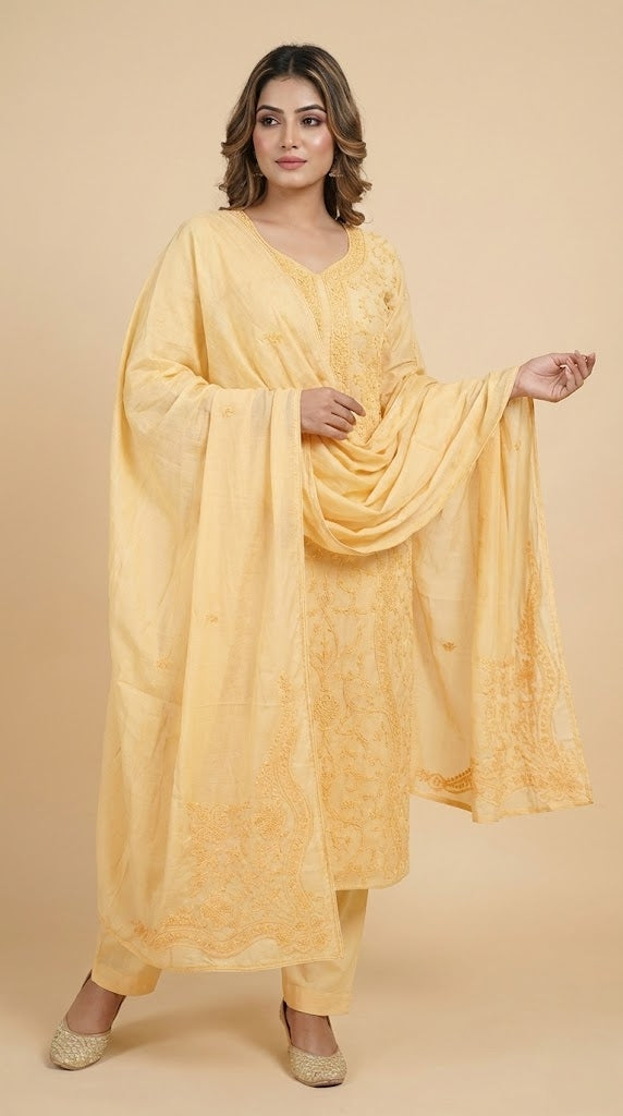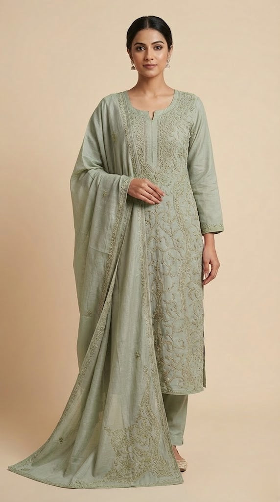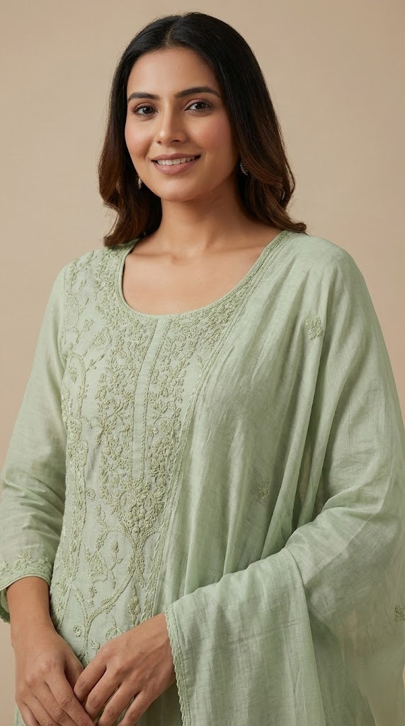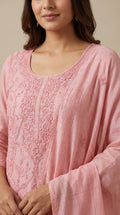 - Body area features scattered chikenkari embroidery for a refined look
