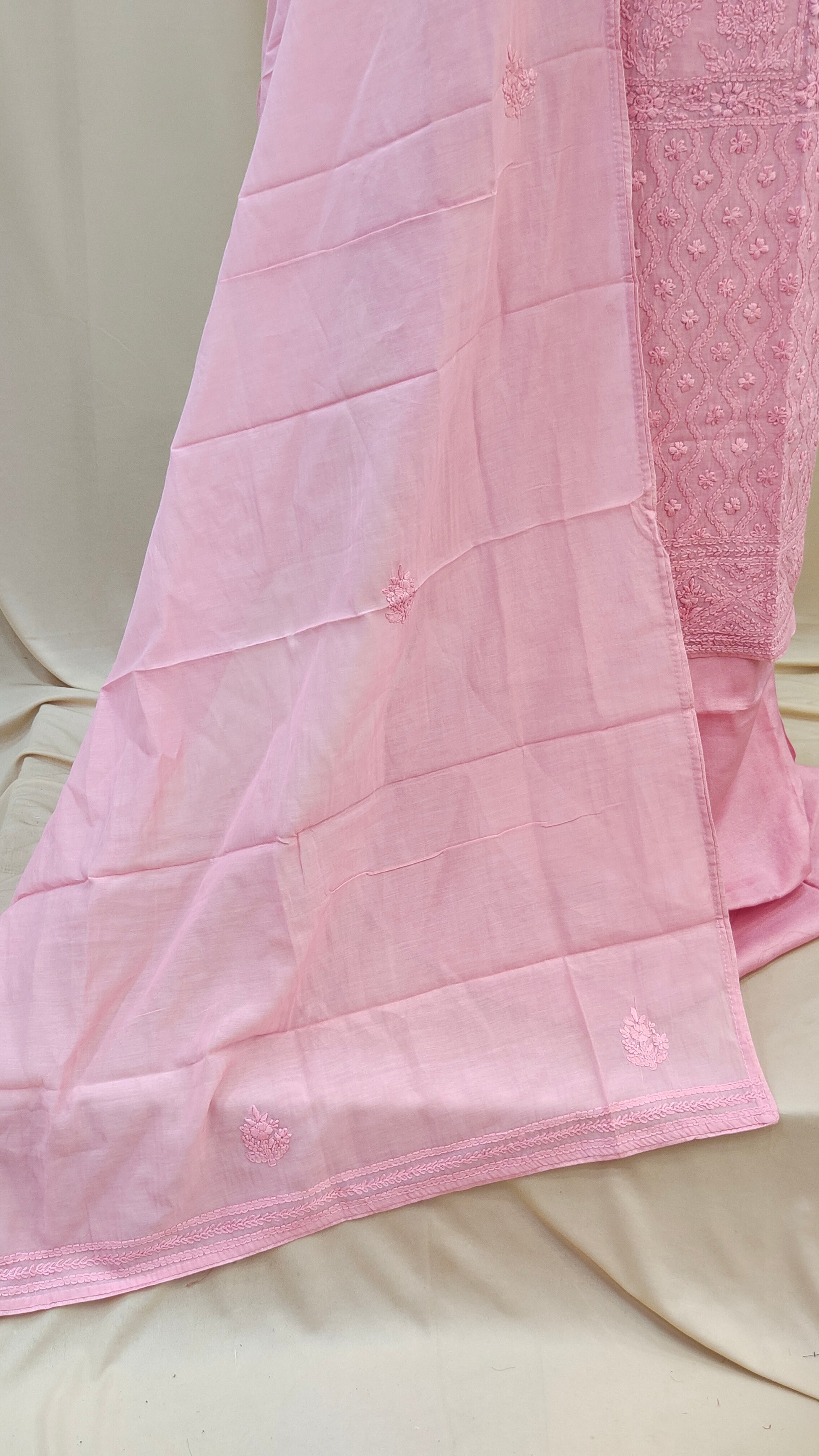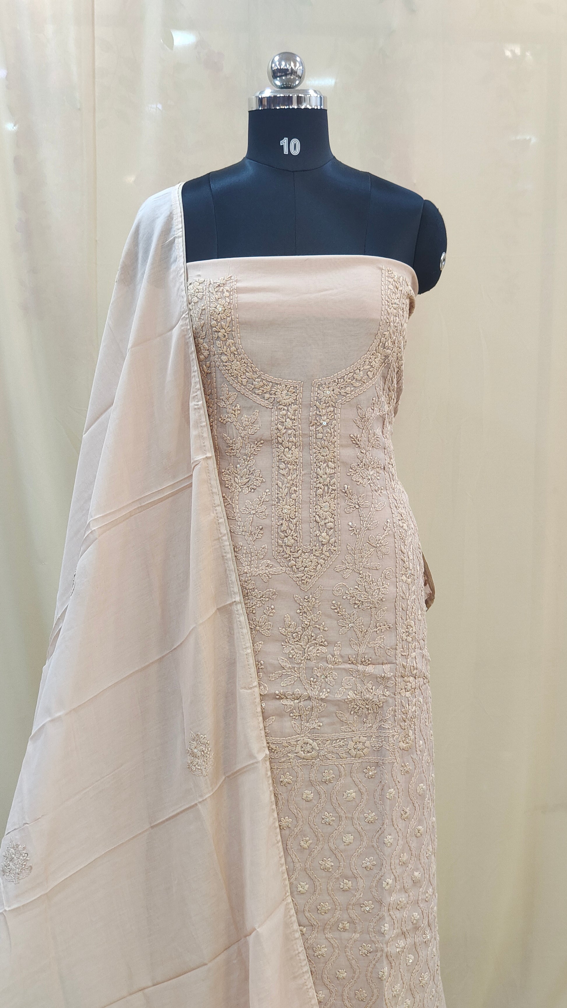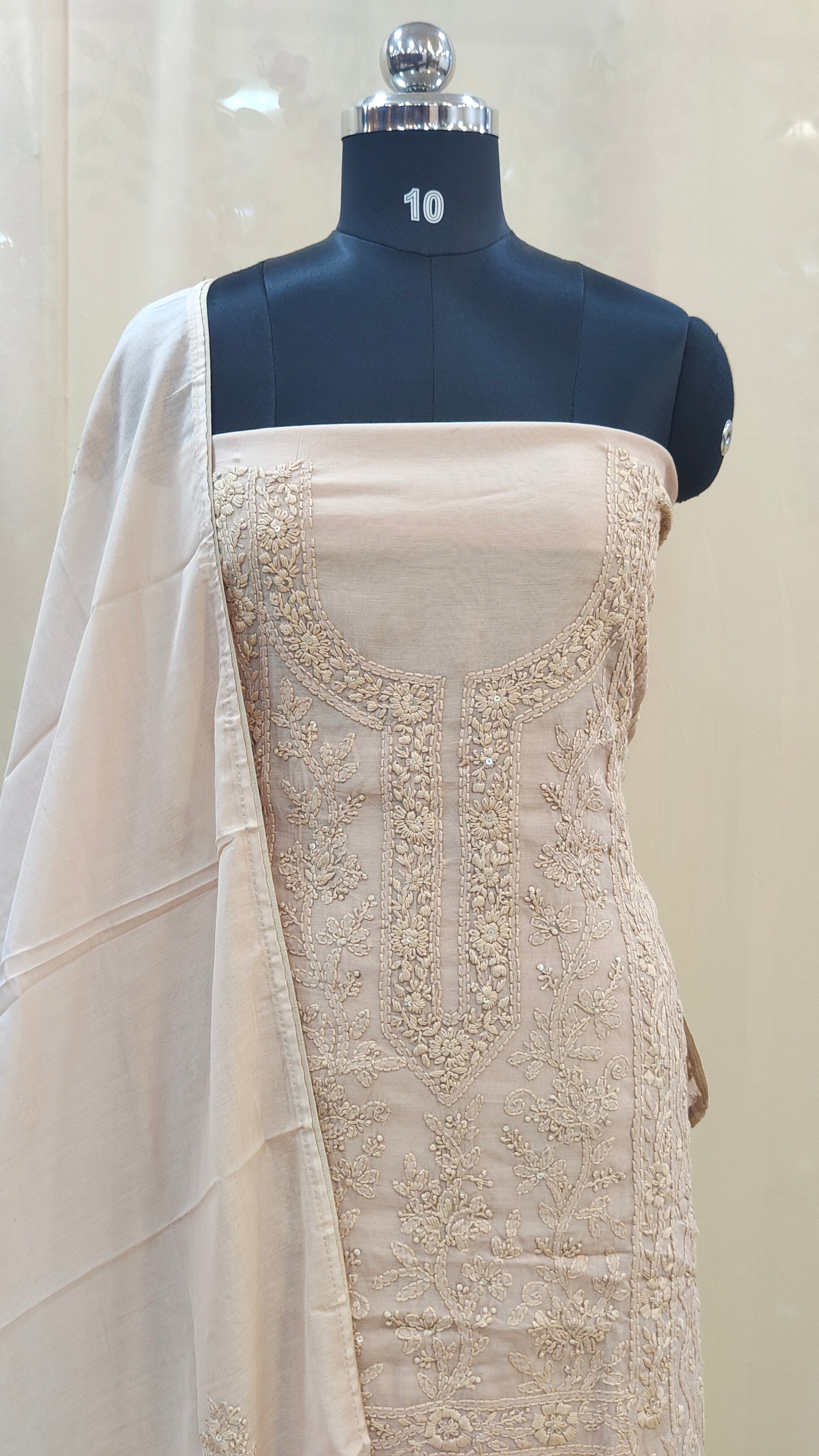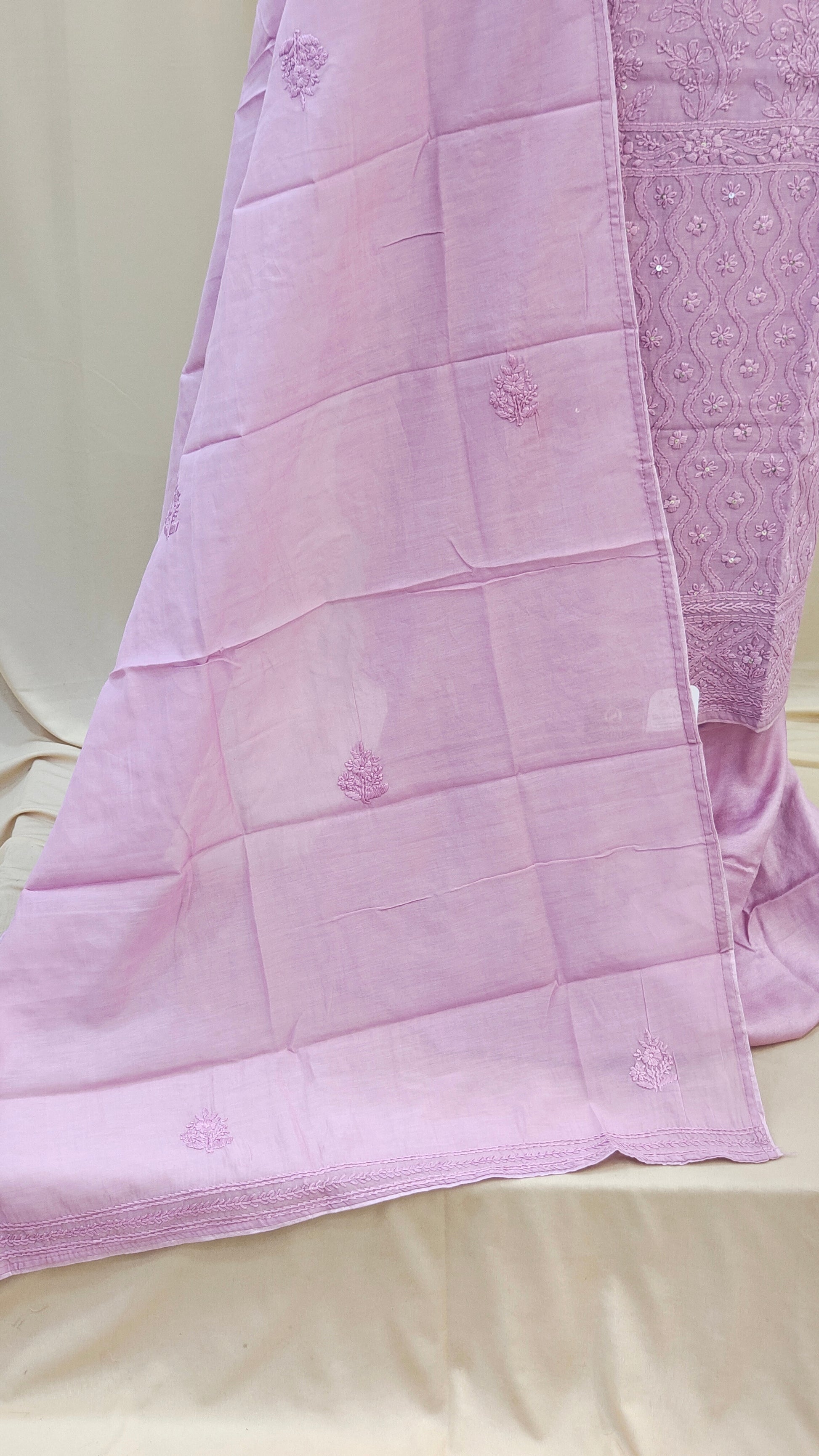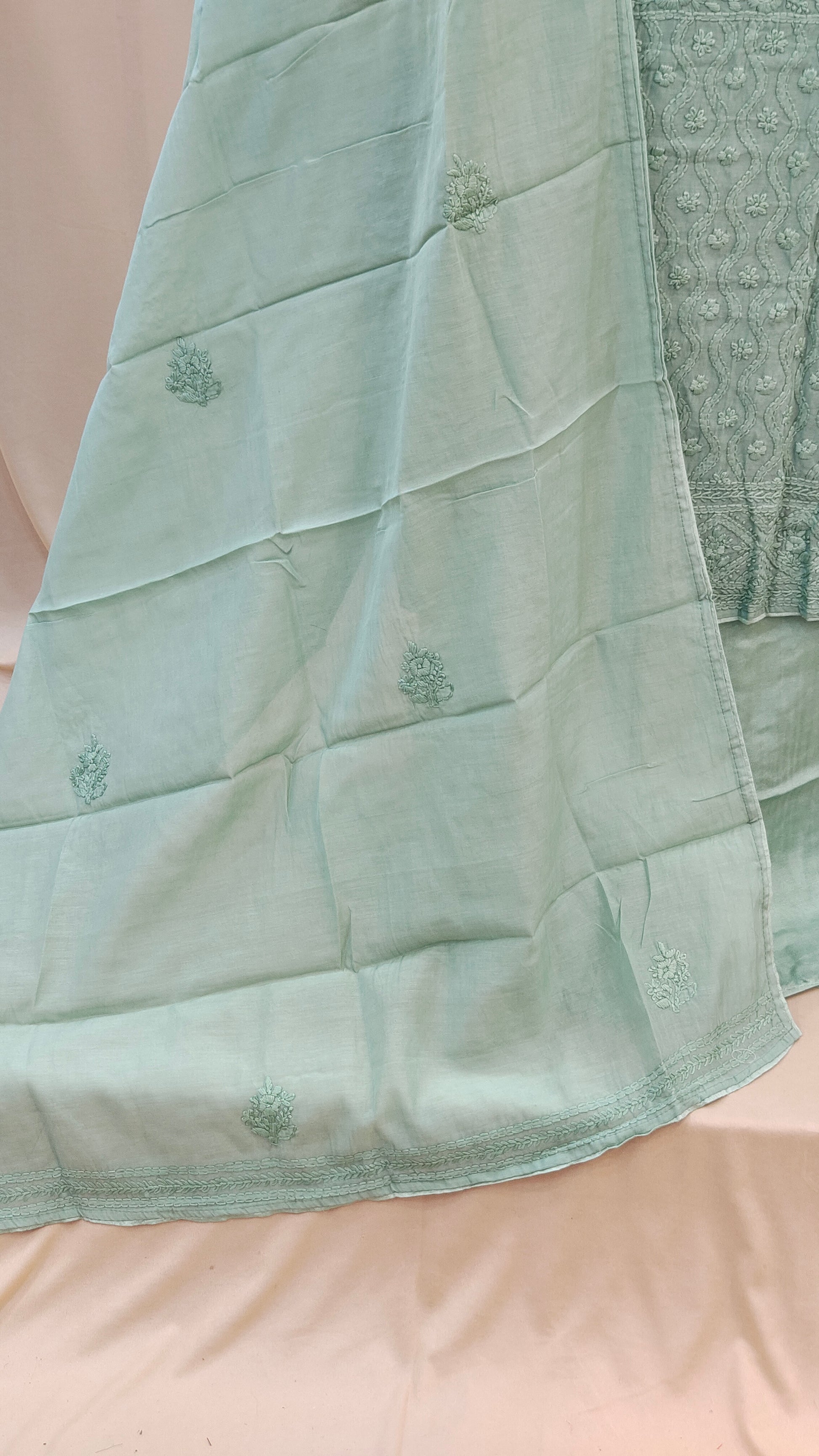 - Body area features scattered chikenkari embroidery for a refined look