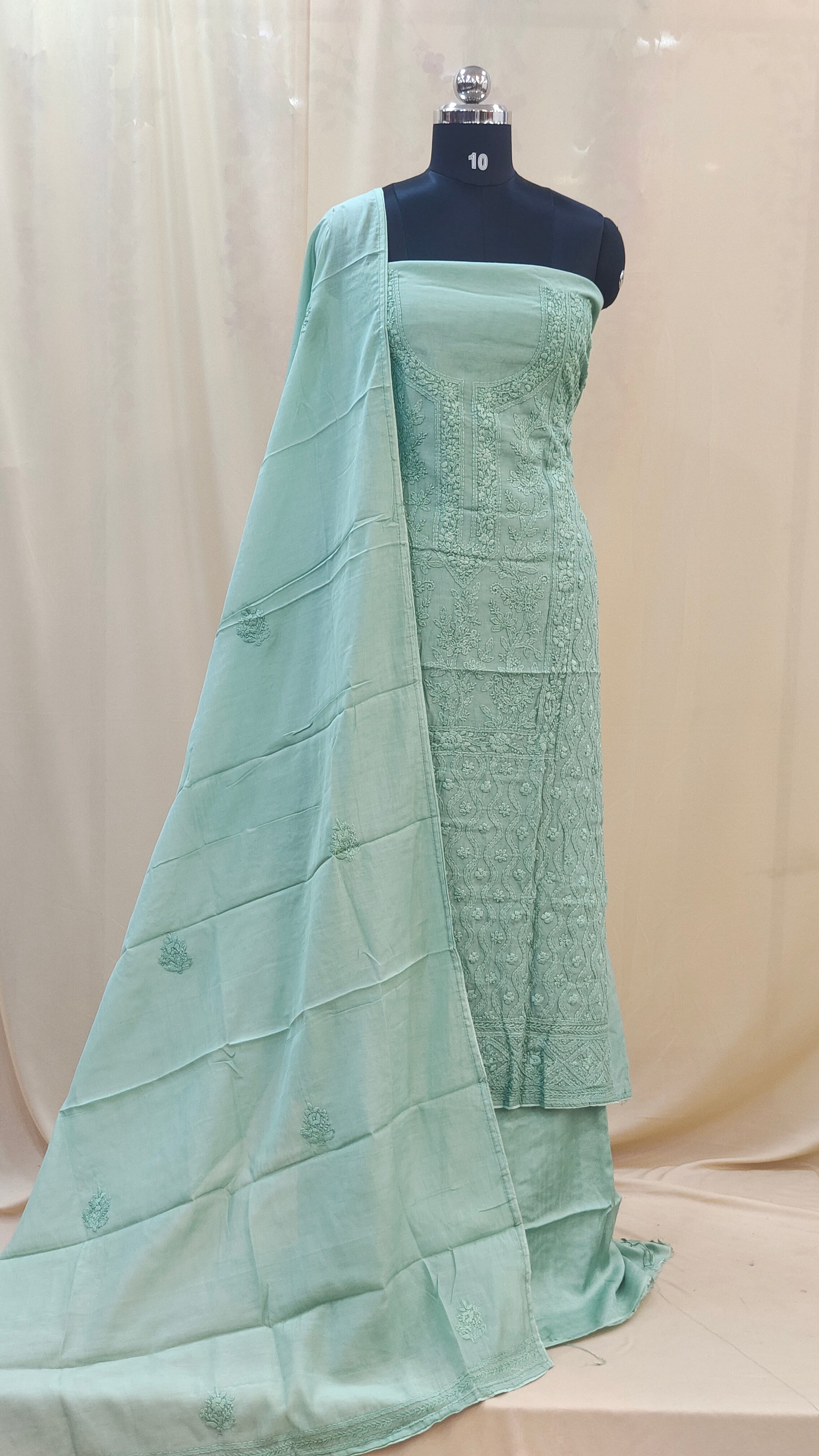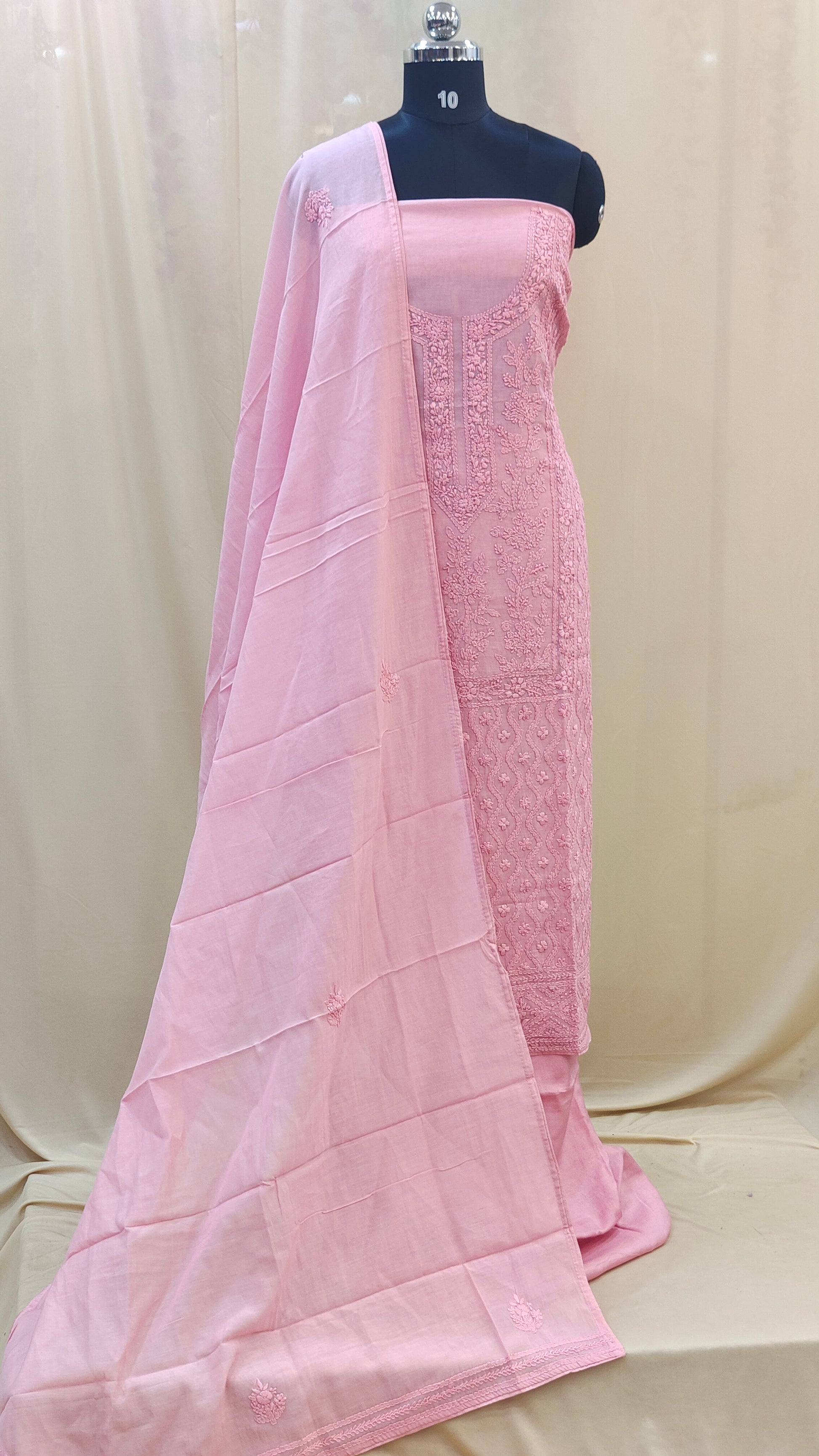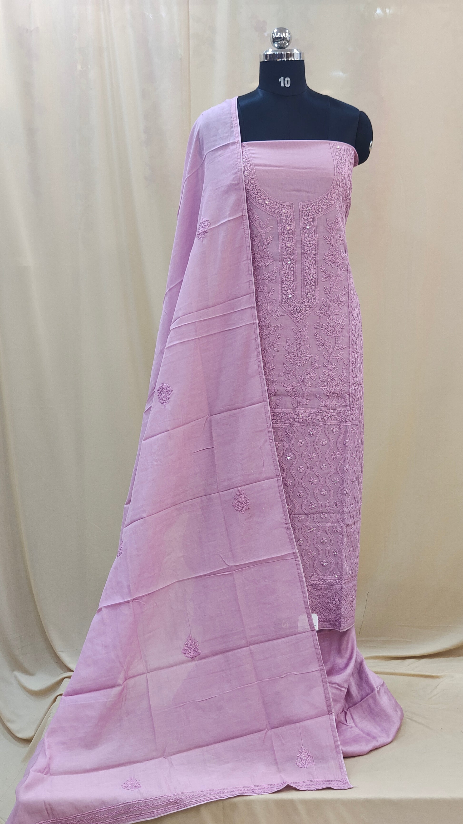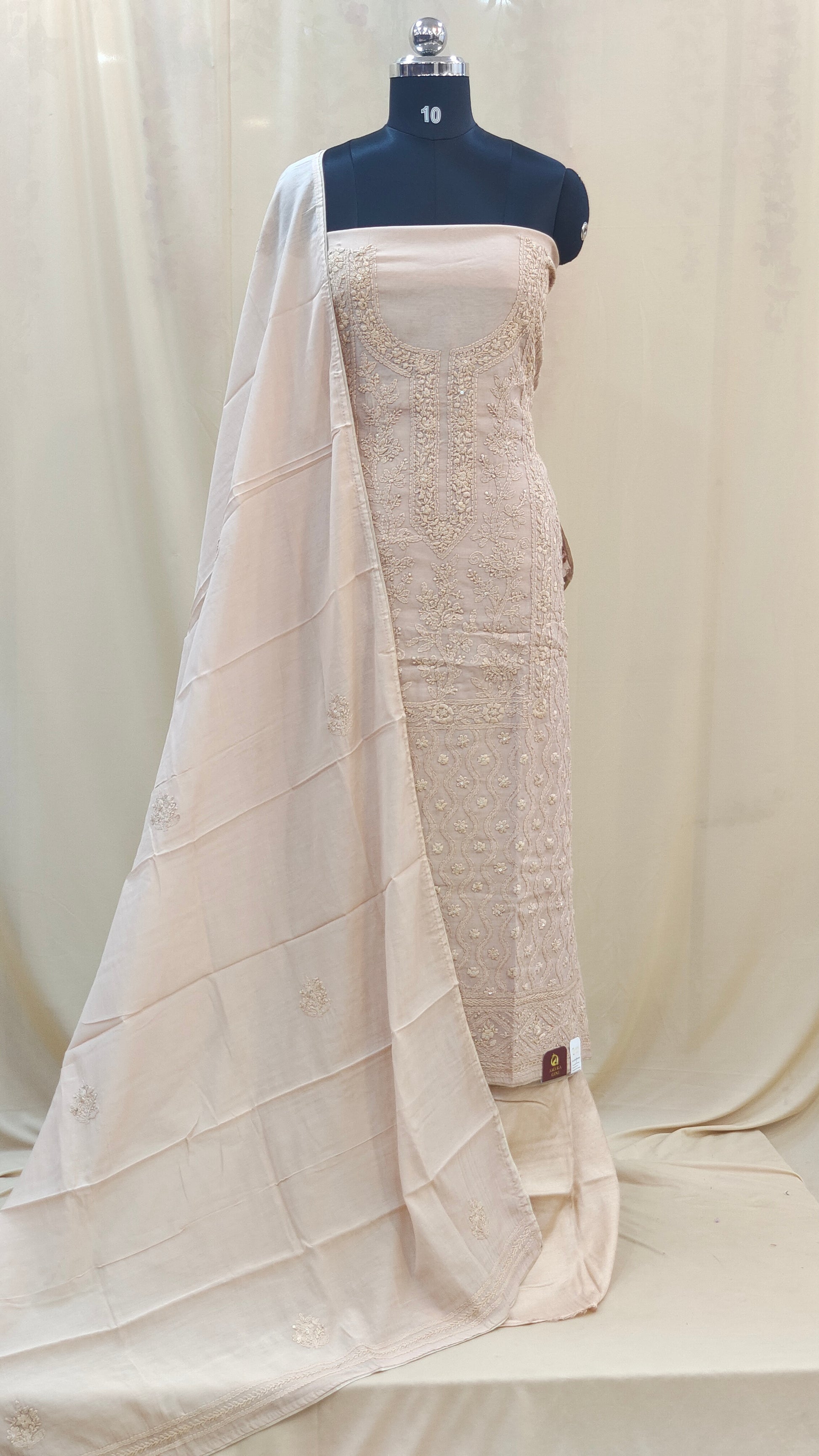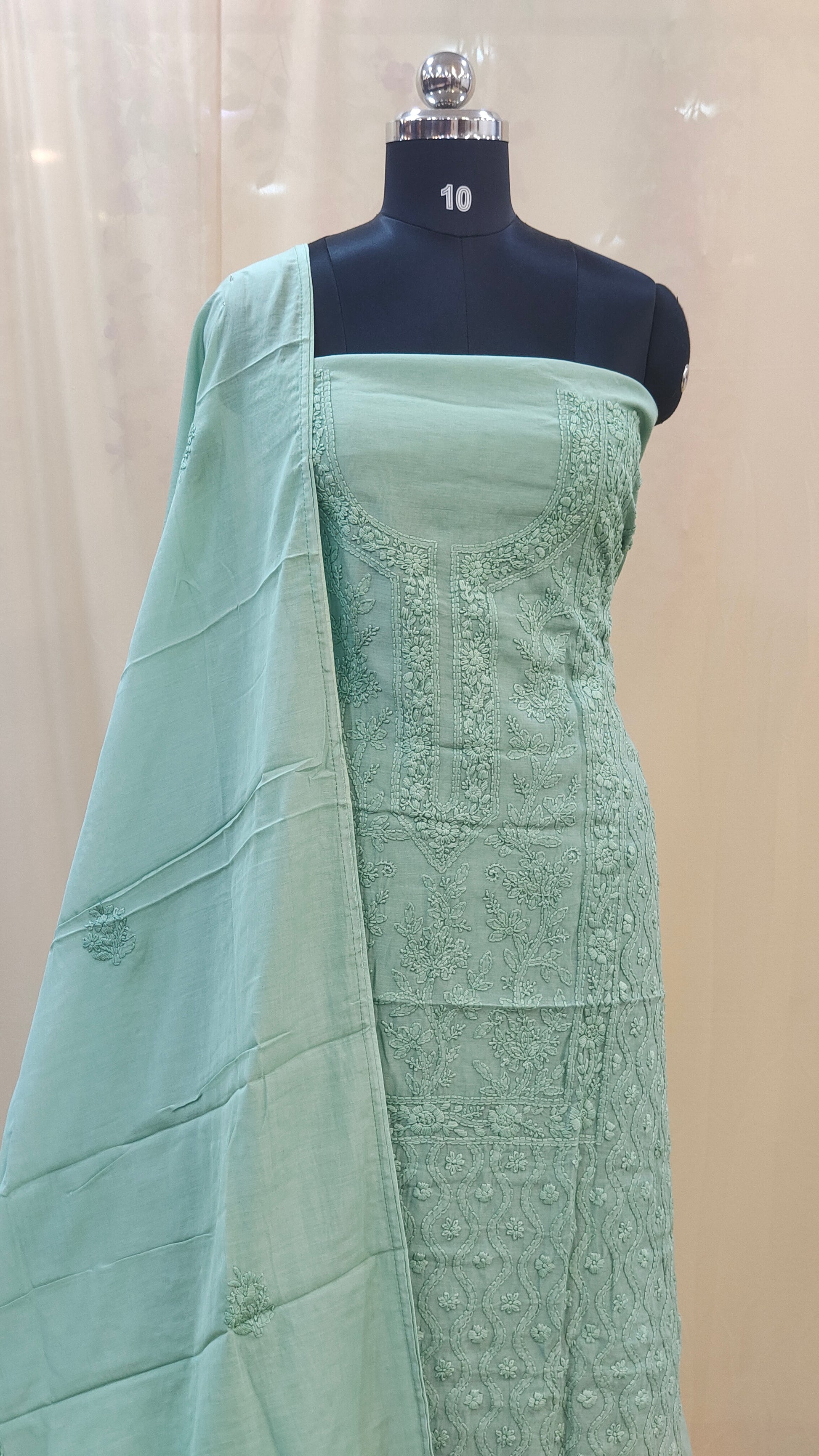 - Body area features scattered chikenkari embroidery for a refined look