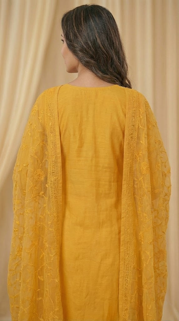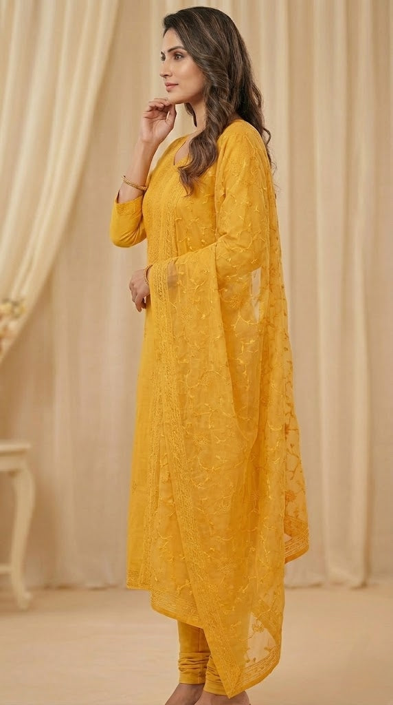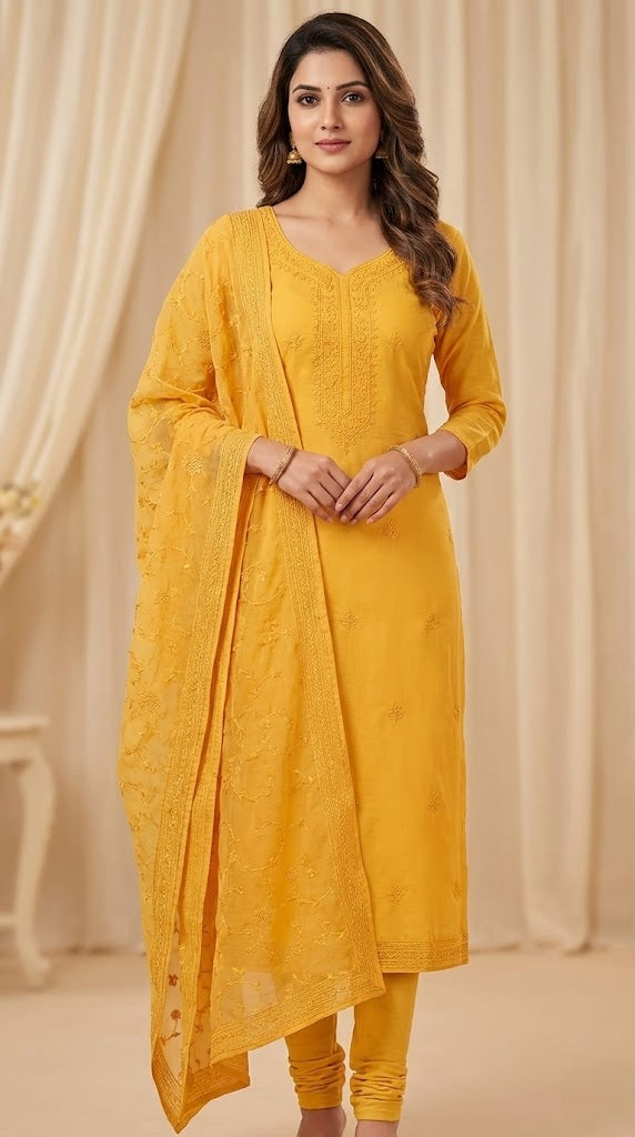 Design : Chikenkari embroidery work on soft silk top with matching dupatta.