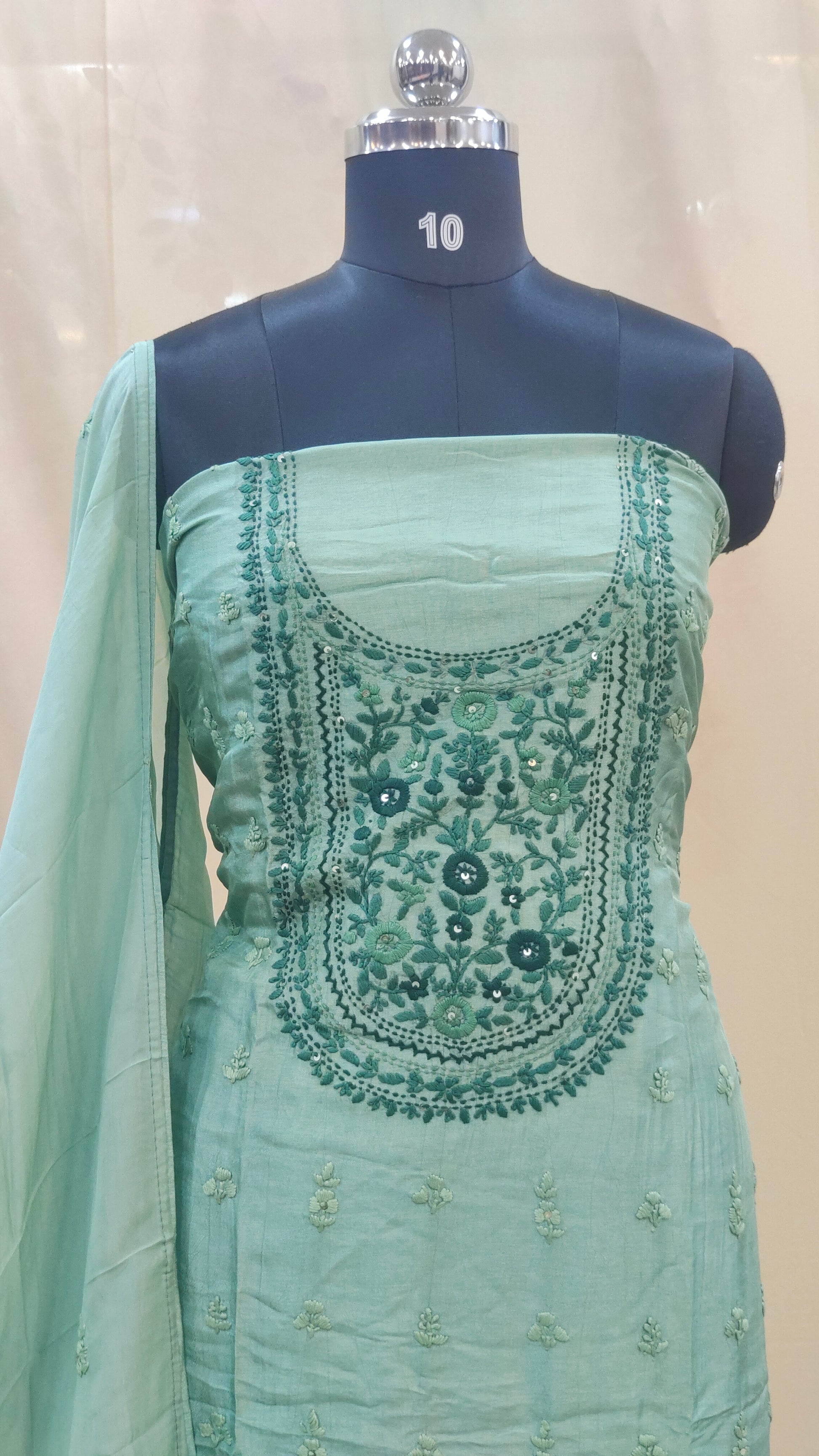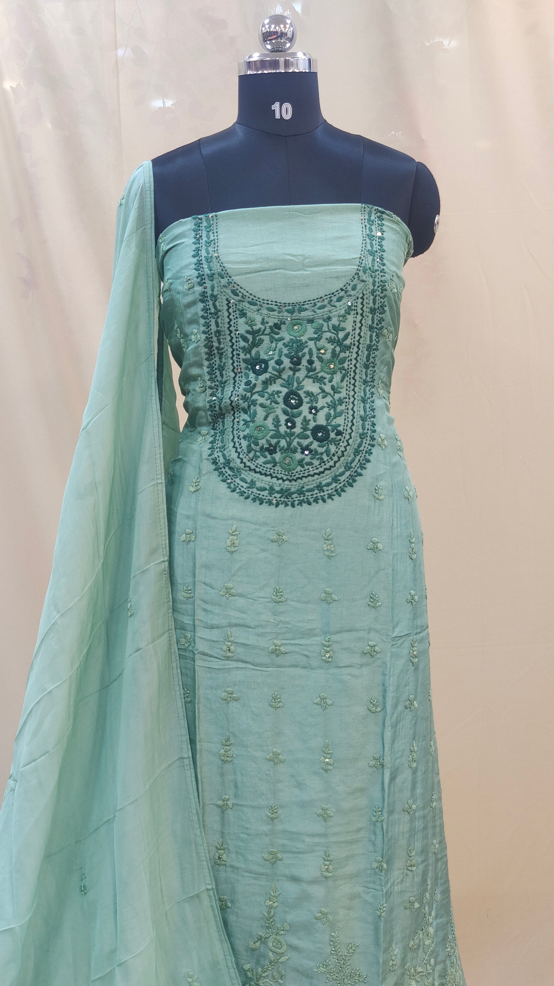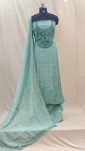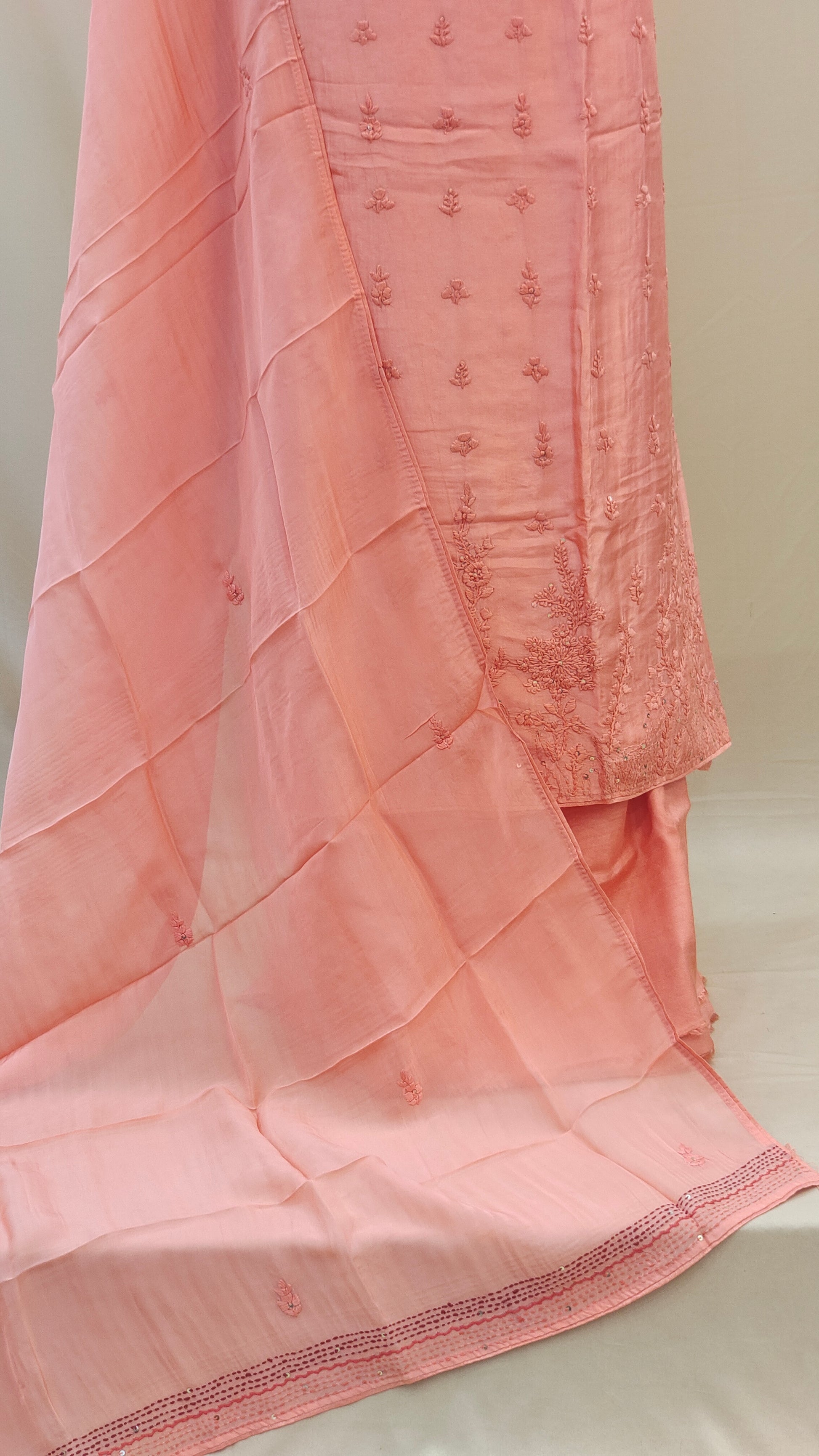 - Body area features scattered chikenkari embroidery for a refined look
