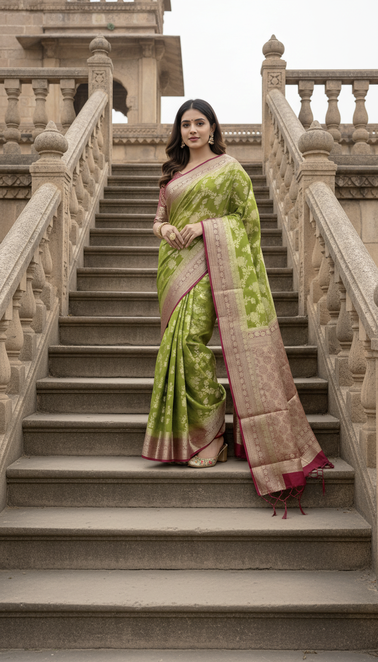 Highlight : Silver zari floral motifs with contrasting rich border for a royal look