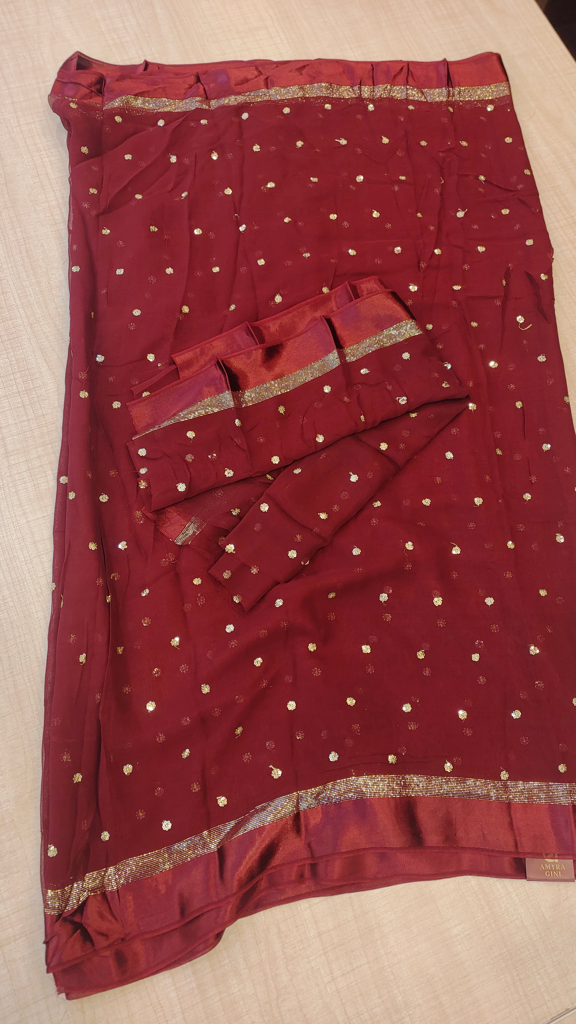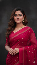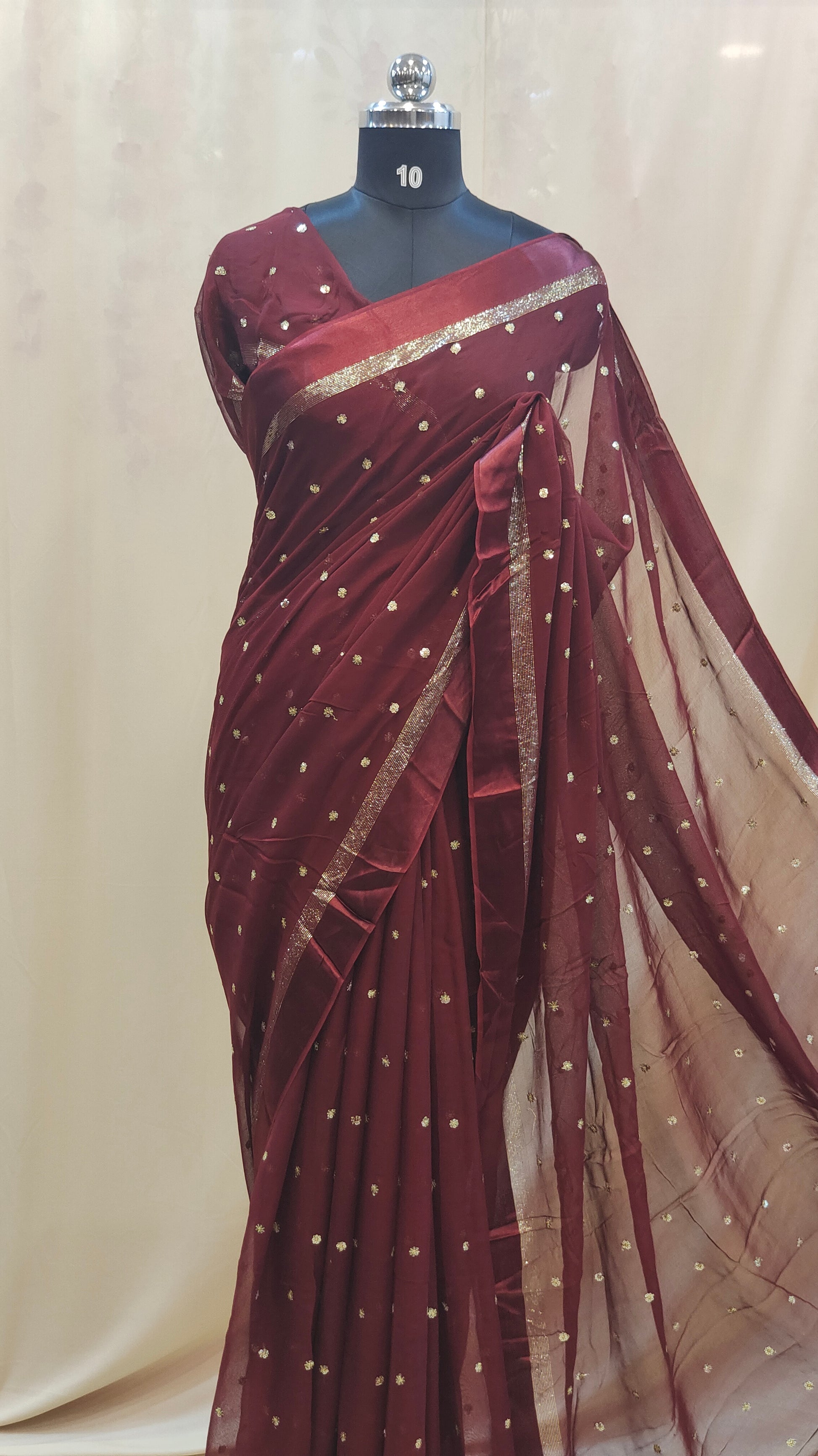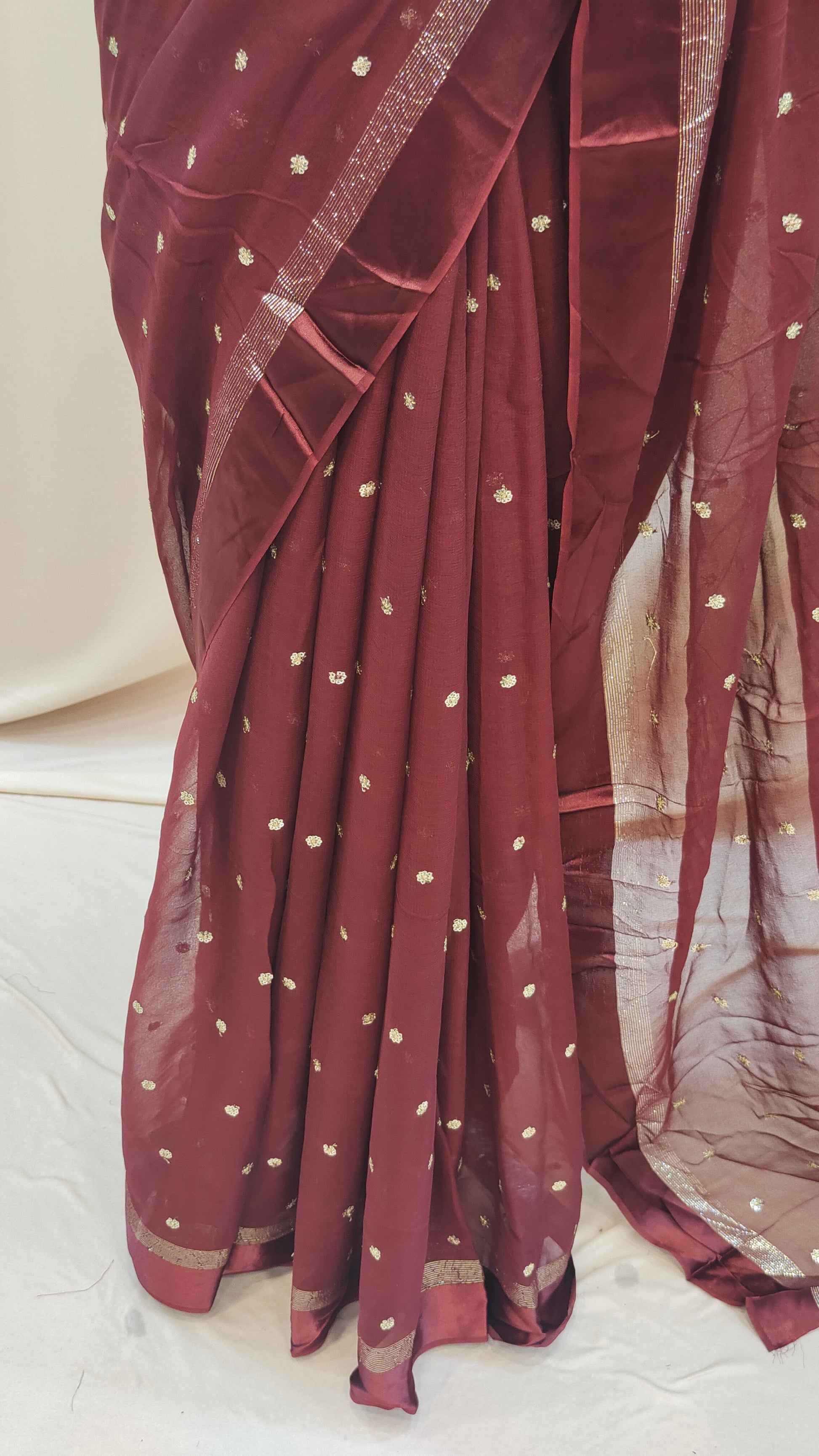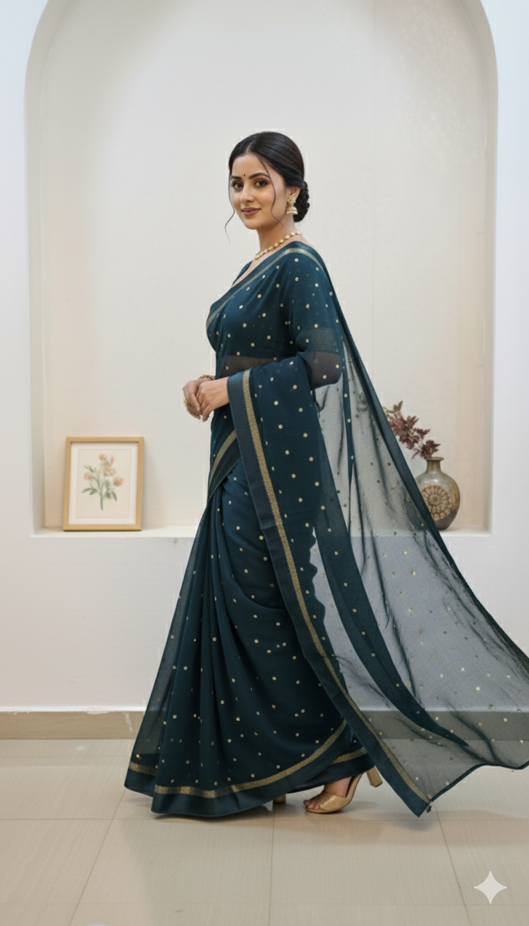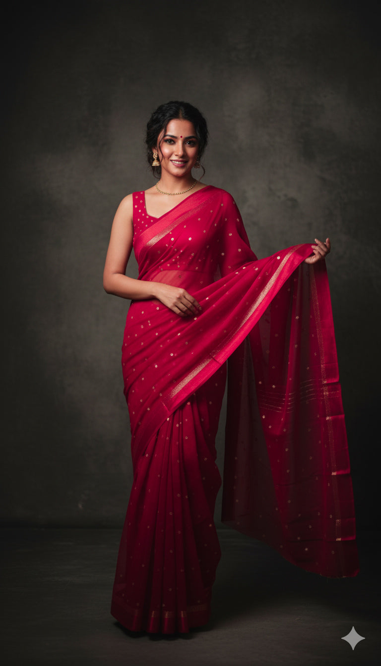 Design : Elegant georgette saree adorned with scattered golden sequin work across the body adding a subtle shimmer and festive charm. The saree end portion is beautifully finished with a soft satin material that enhances its rich and graceful look.