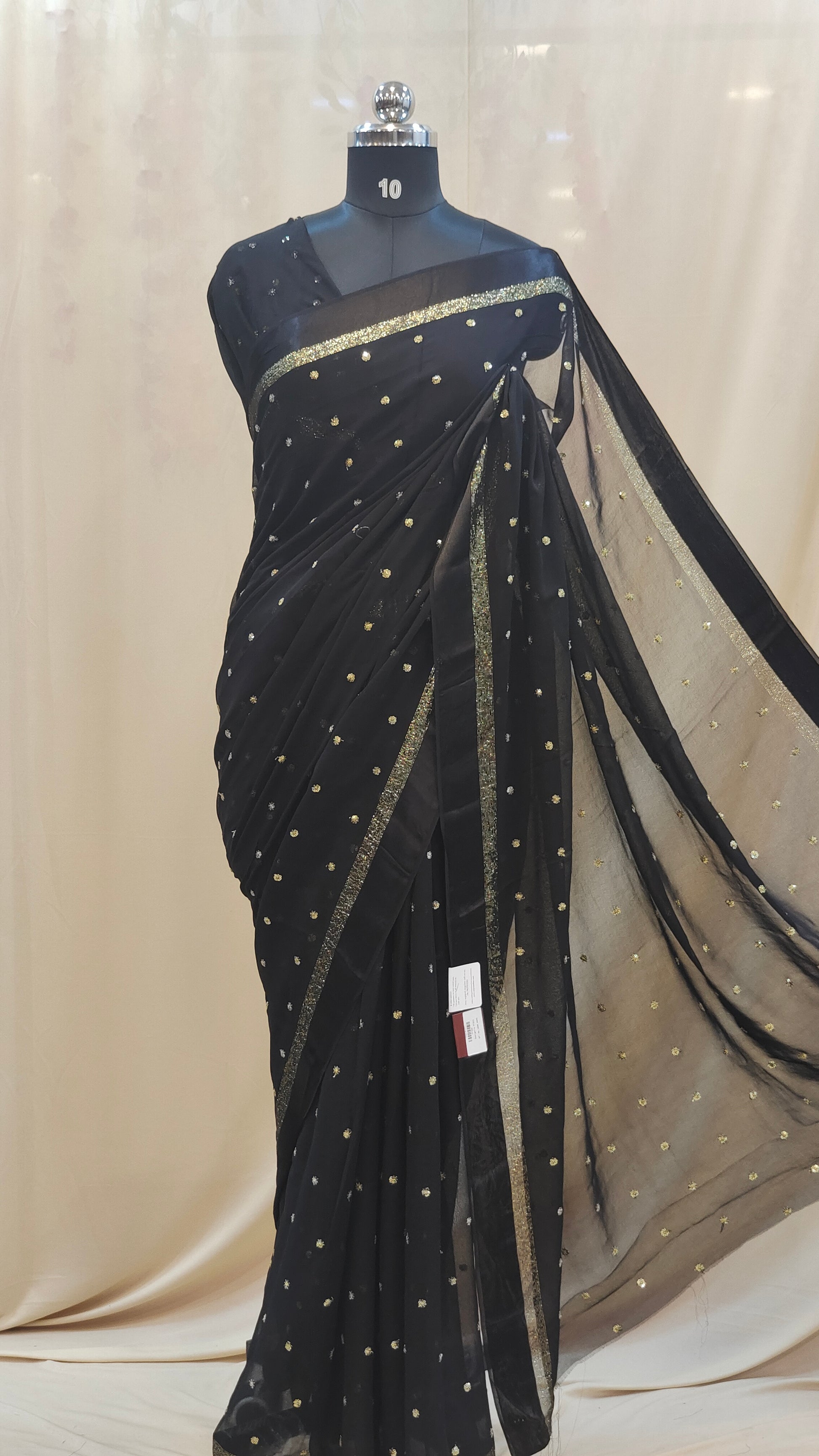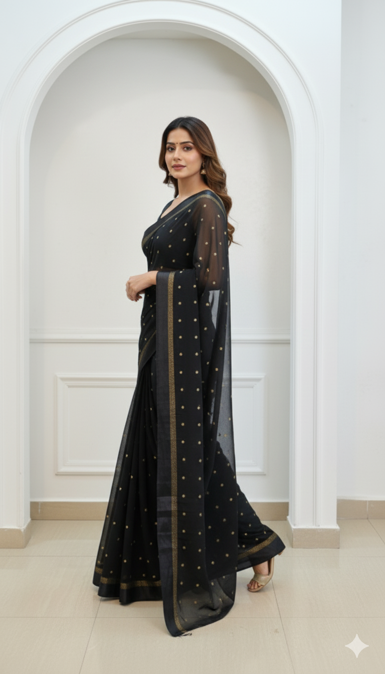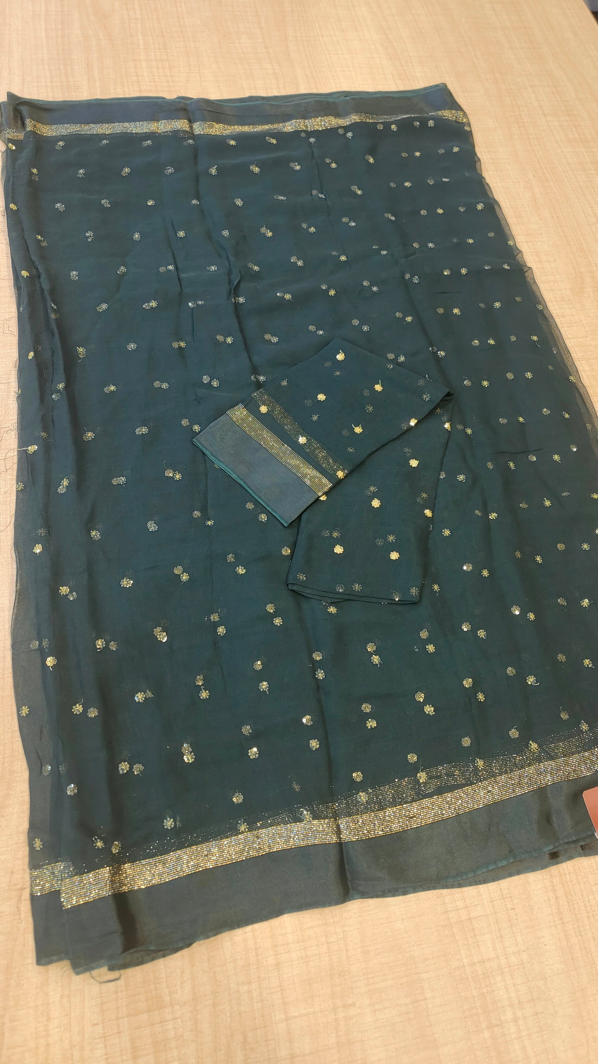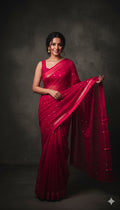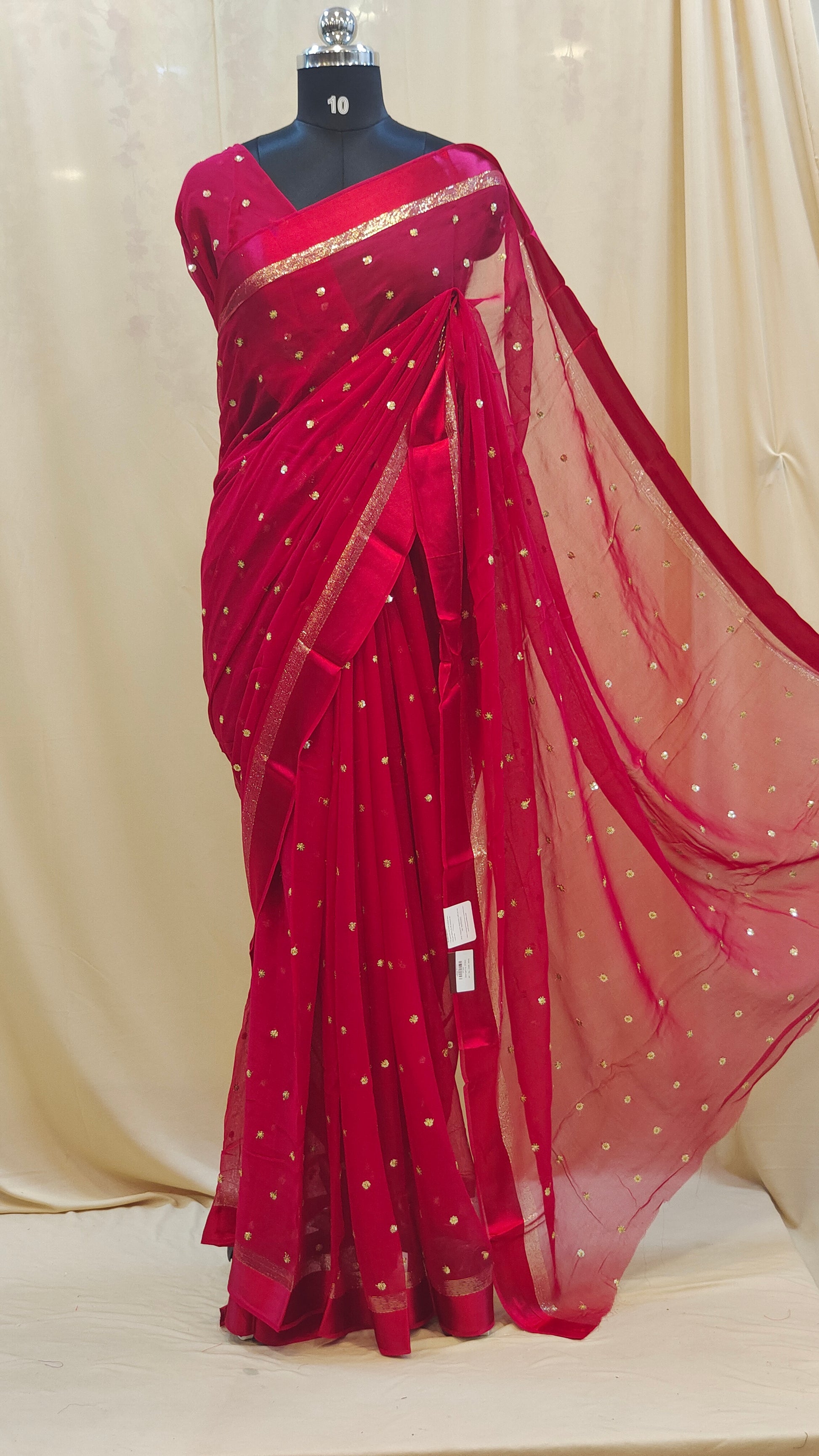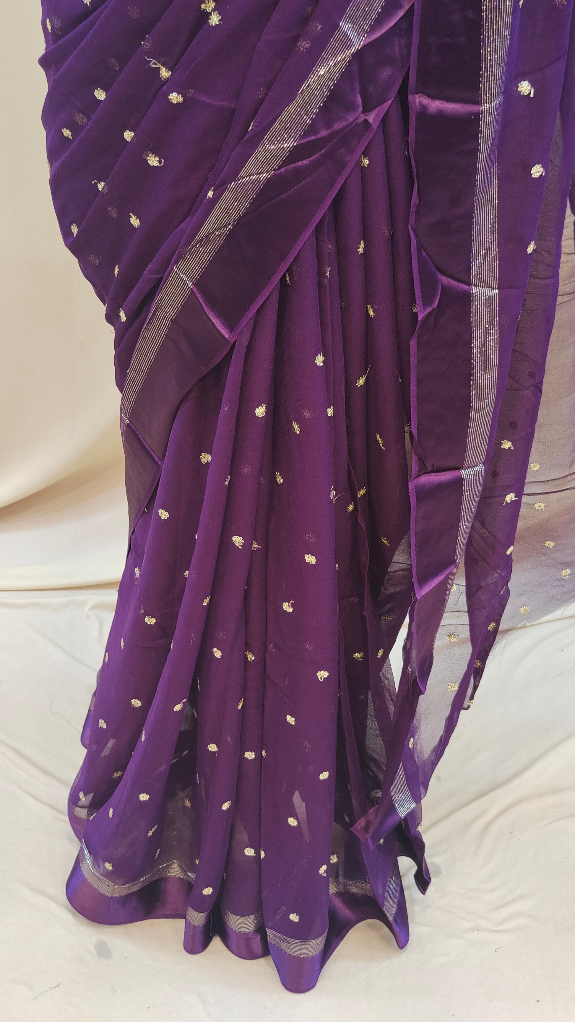 Design : Elegant georgette saree adorned with scattered golden sequin work across the body adding a subtle shimmer and festive charm. The saree end portion is beautifully finished with a soft satin material that enhances its rich and graceful look.