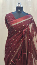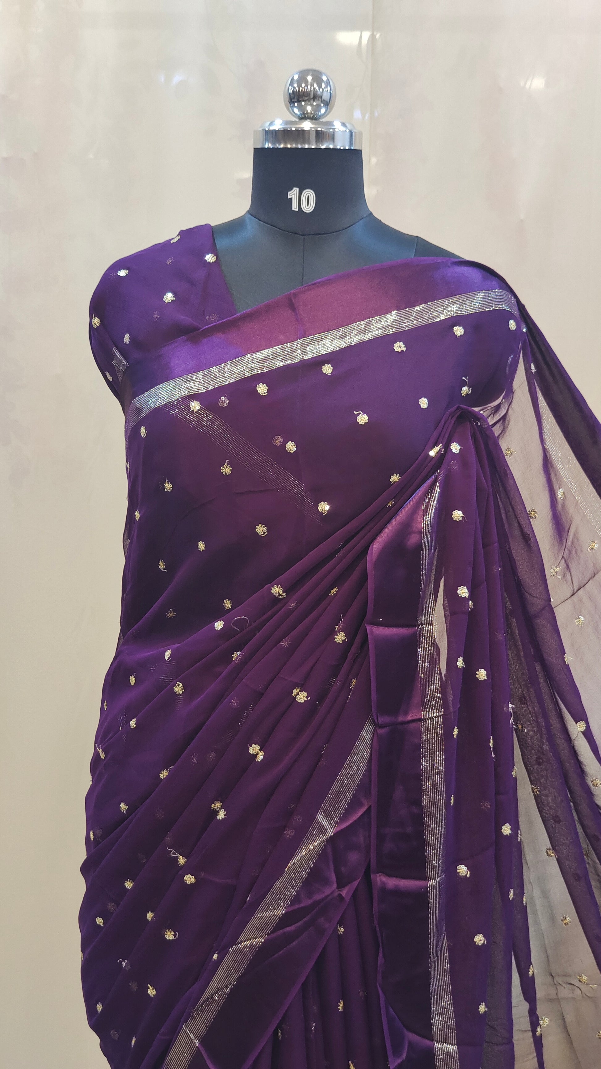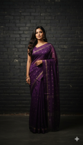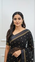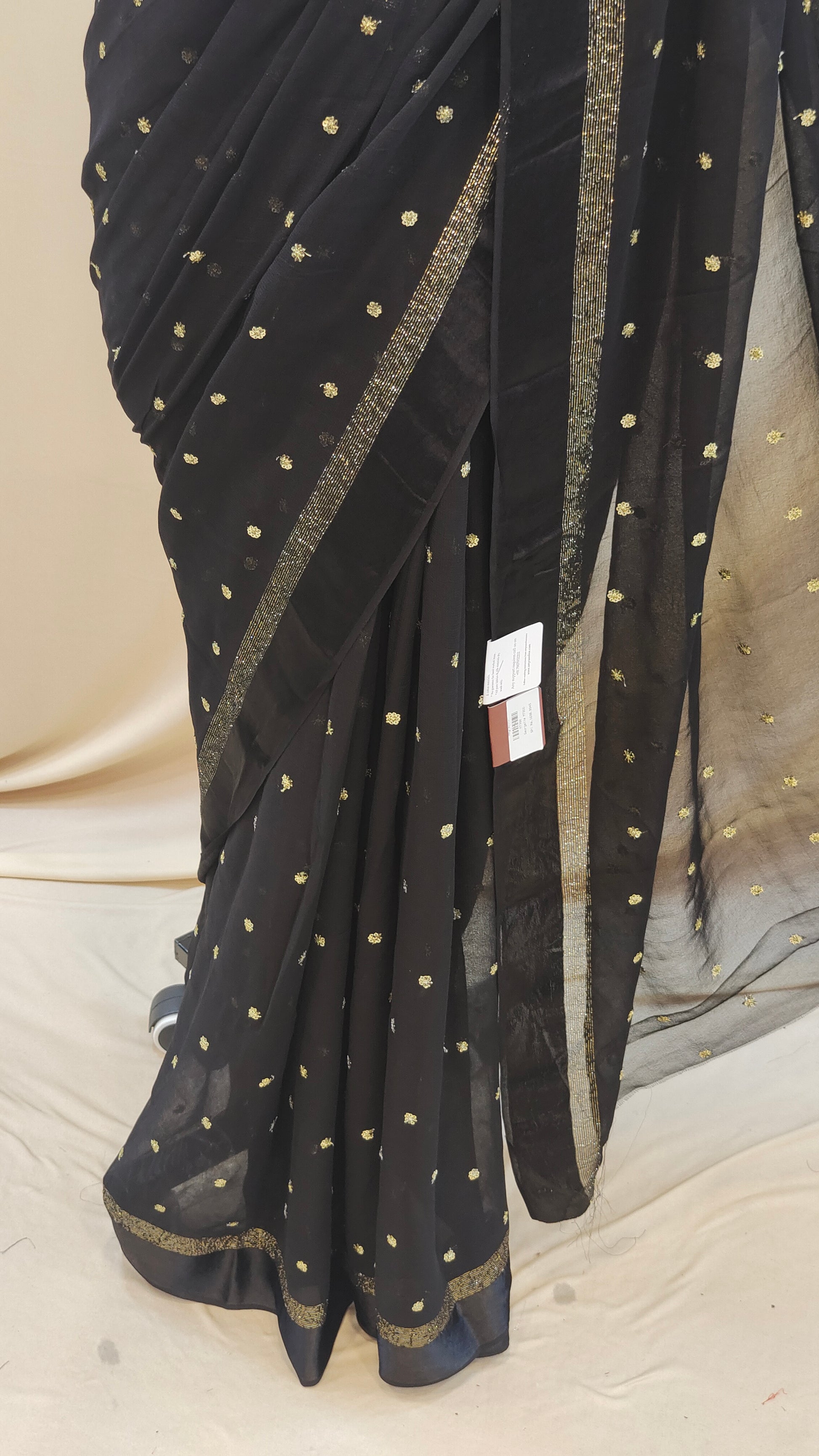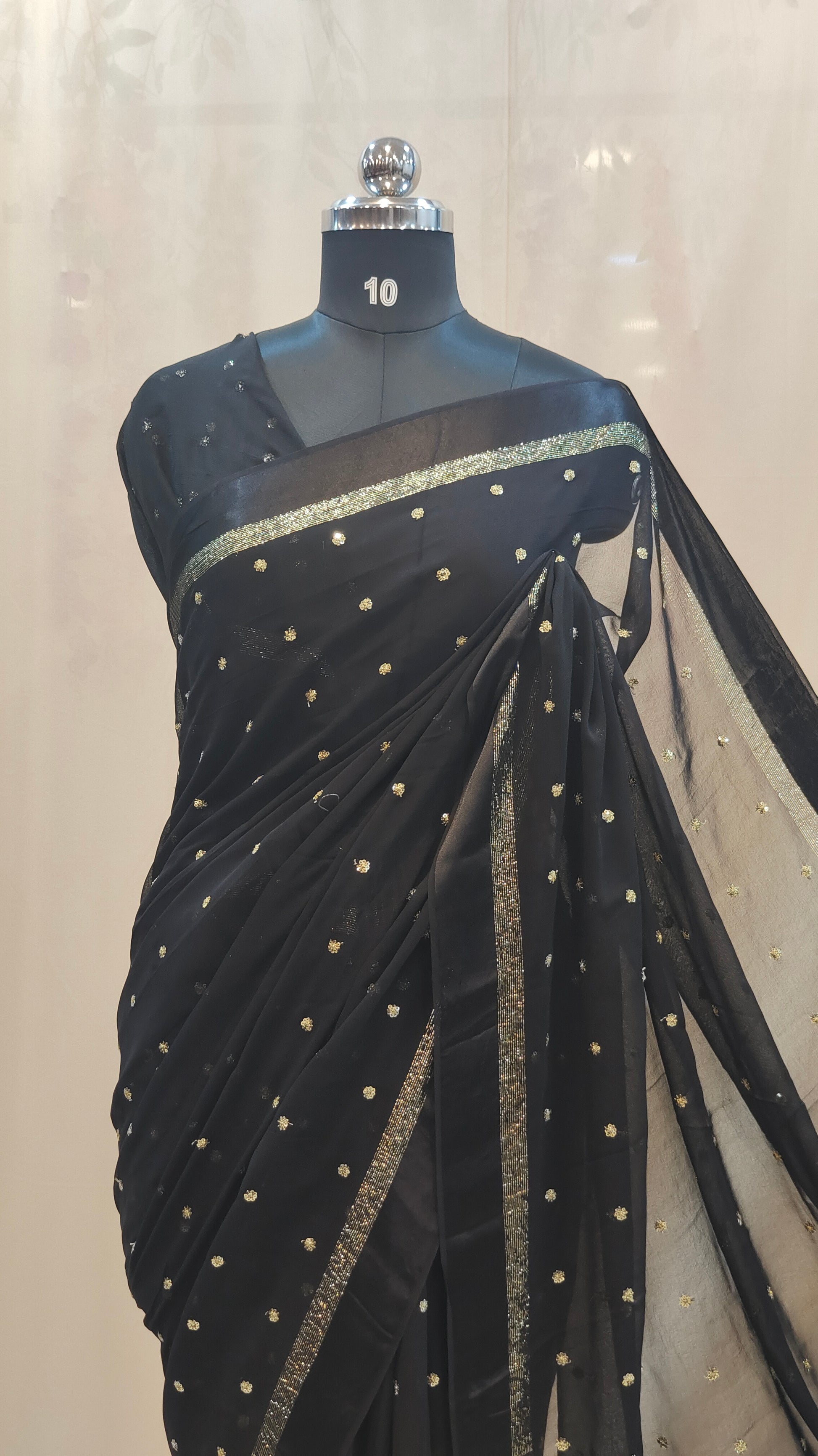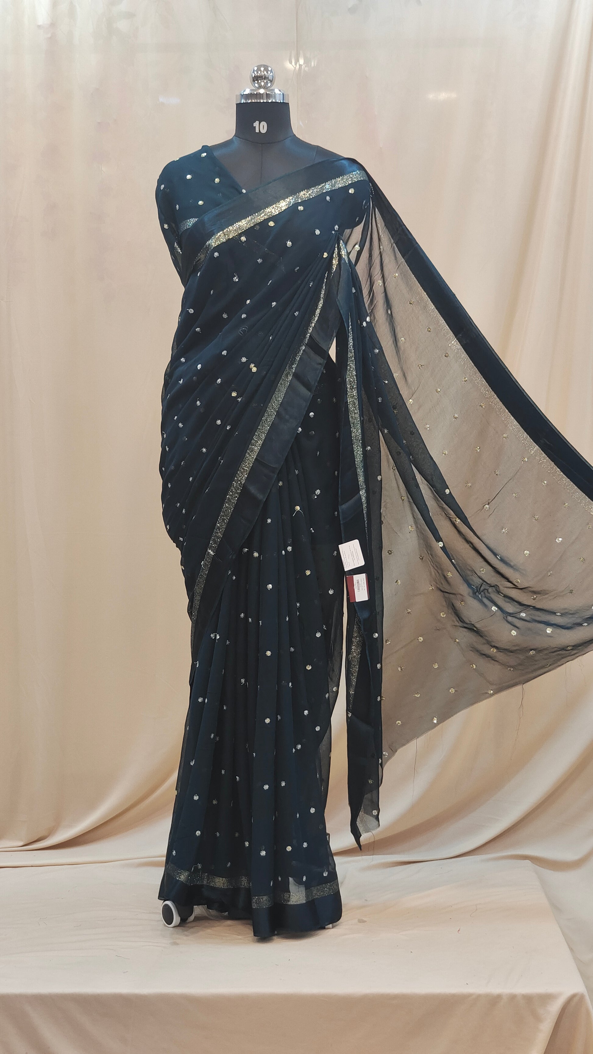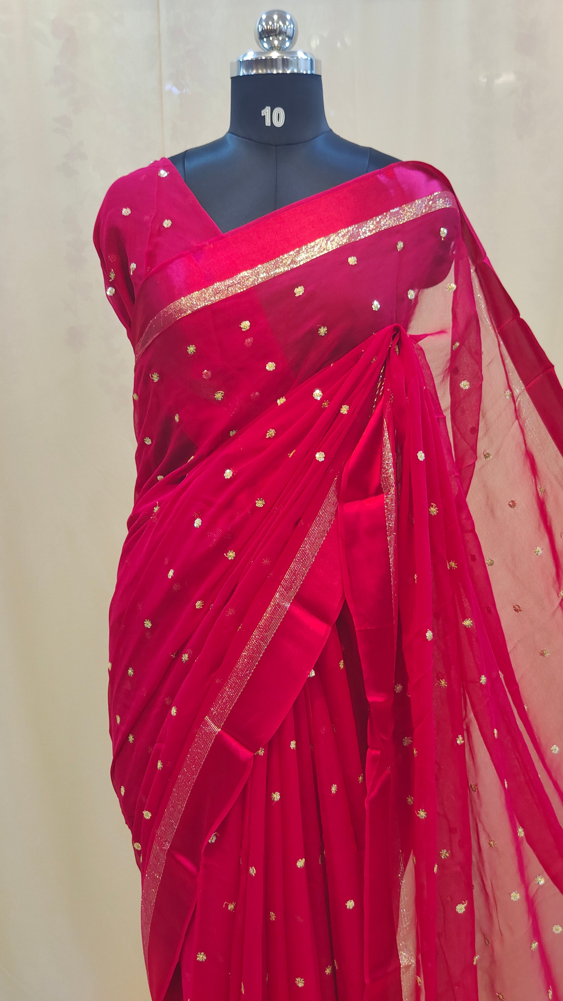 Design : Elegant georgette saree adorned with scattered golden sequin work across the body adding a subtle shimmer and festive charm. The saree end portion is beautifully finished with a soft satin material that enhances its rich and graceful look.