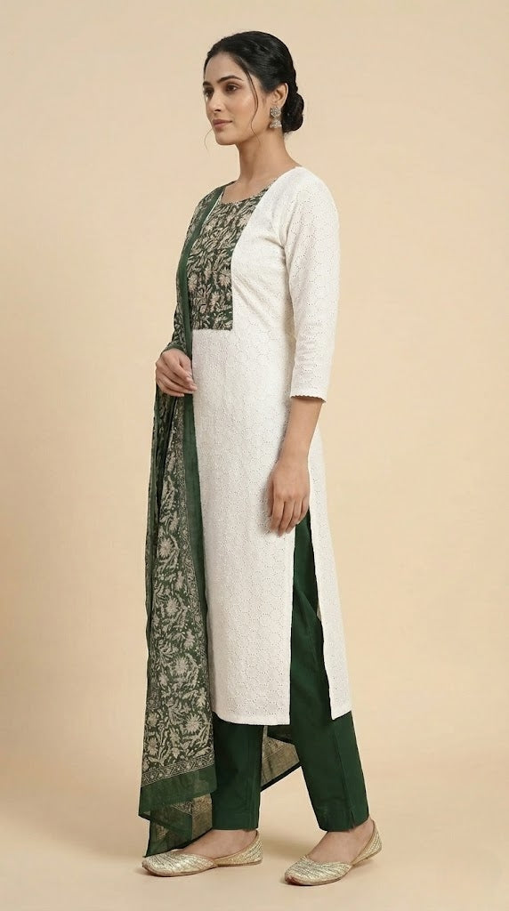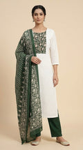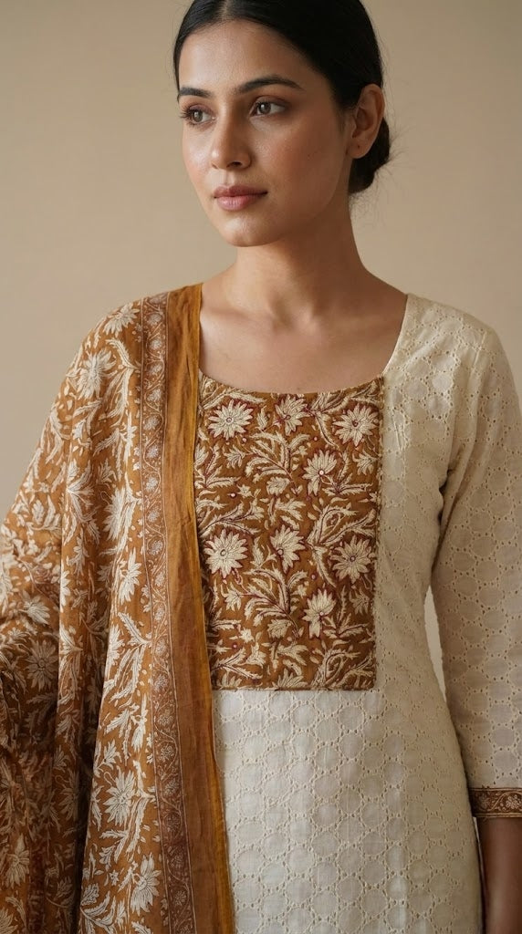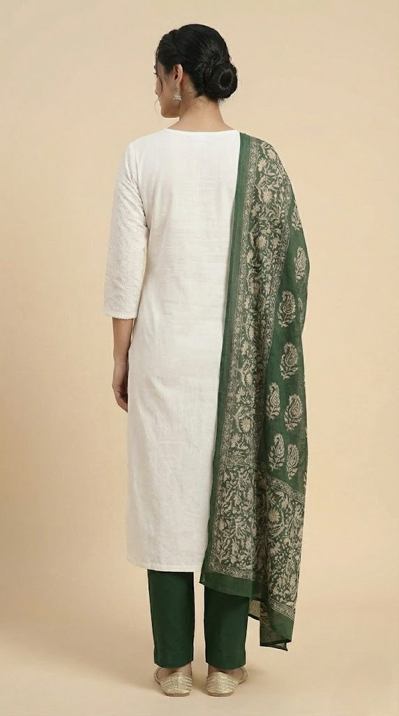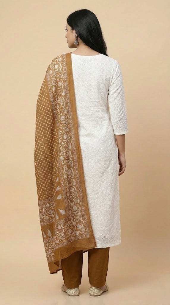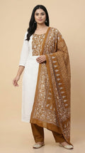 Dupatta : The cotton dupatta comes with a ajrak print design and detailing on the ends giving the outfit a graceful and stylish finish.