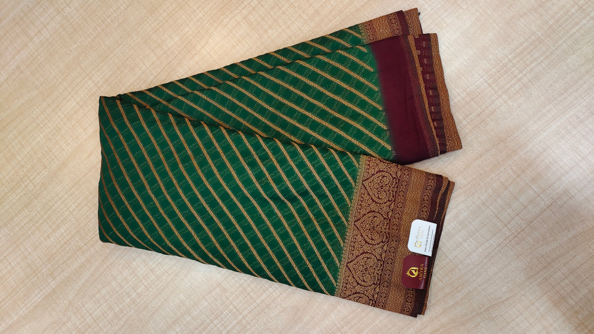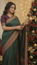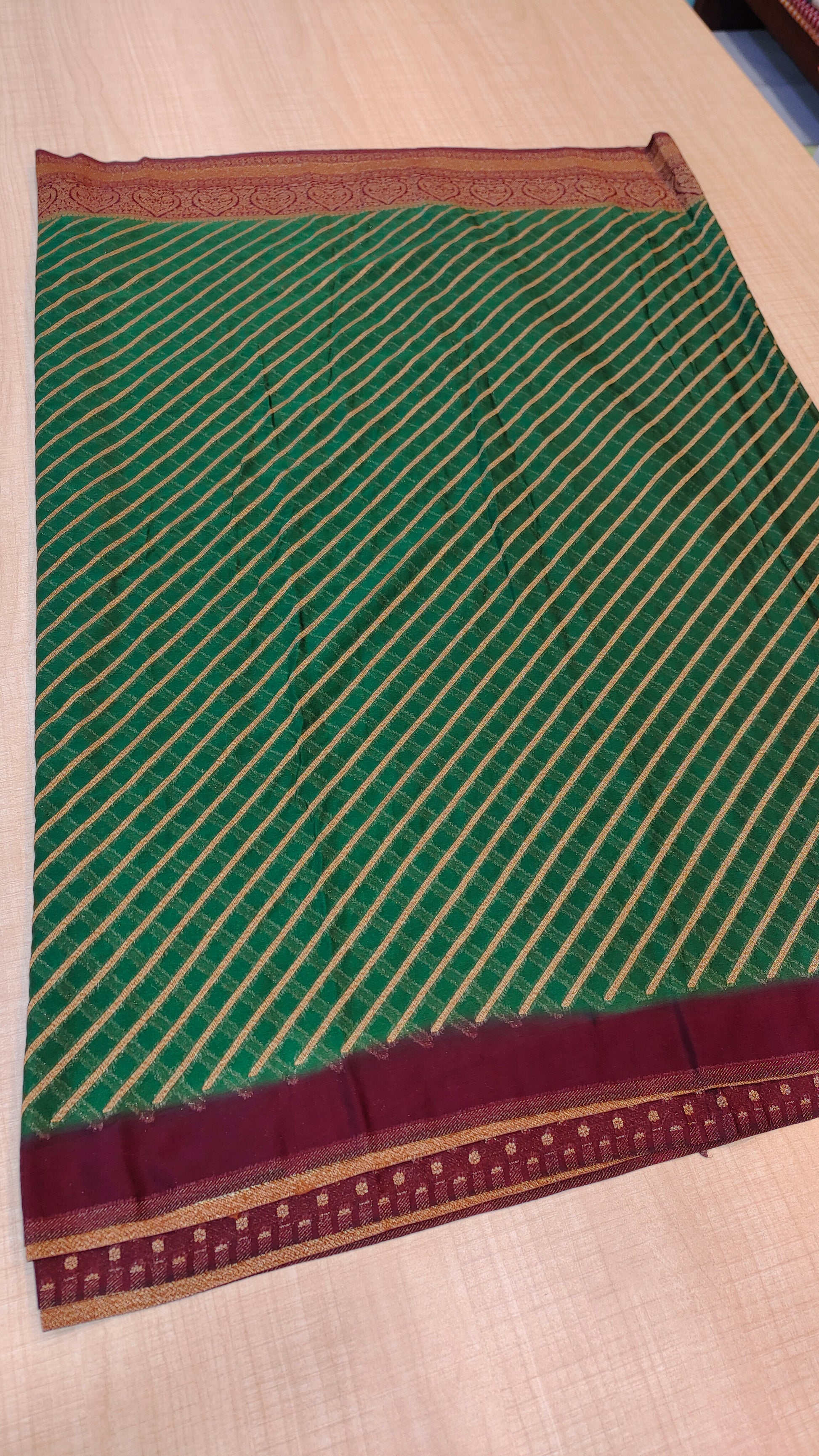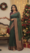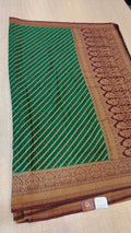 Design :Rich emerald green body with elegent gold diagonal zari stripes,giving a graceful and elongated look.The border is grand and traditional ,featuring intricate gold zari floral and paisley motifs woven in a classic temple -style pattern.contrast deep brown and antique gold tones in the border enhance the richness and heritage feel.