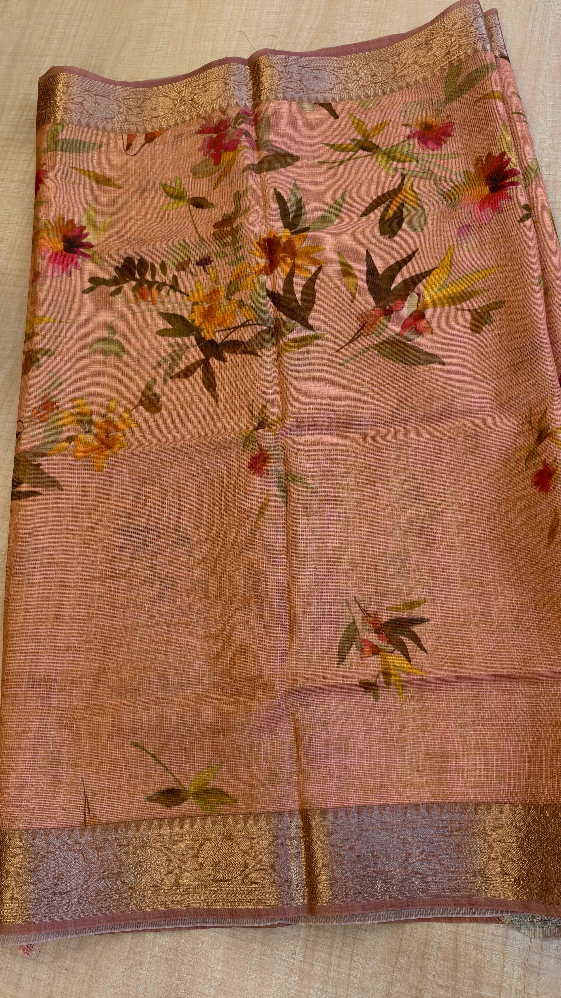 Design : This elegant kotta banarasi saree is beautifully crafted with an oxidized silver zari banarasi weaving border adding a touch of traditional charm.
