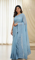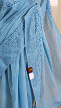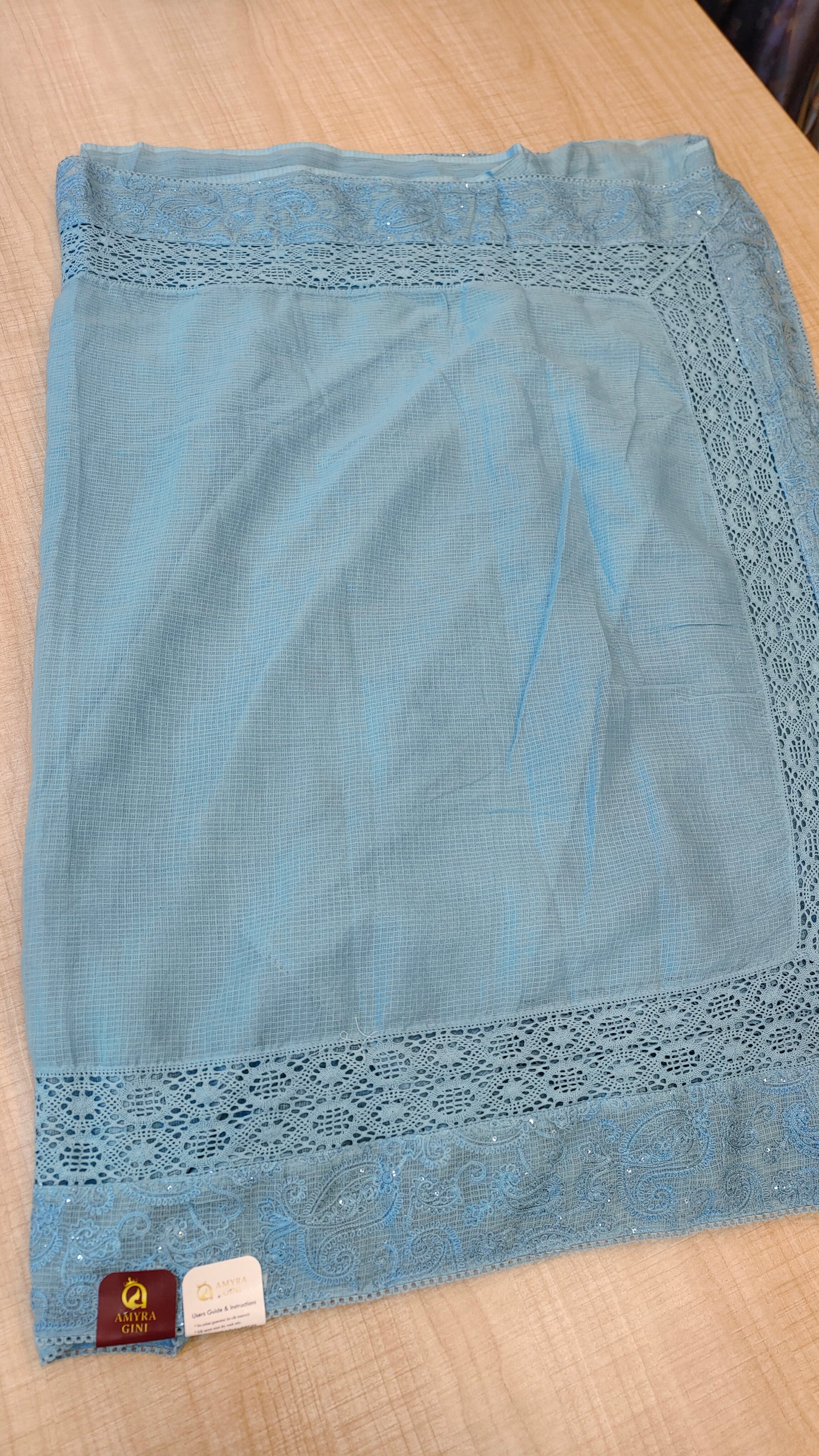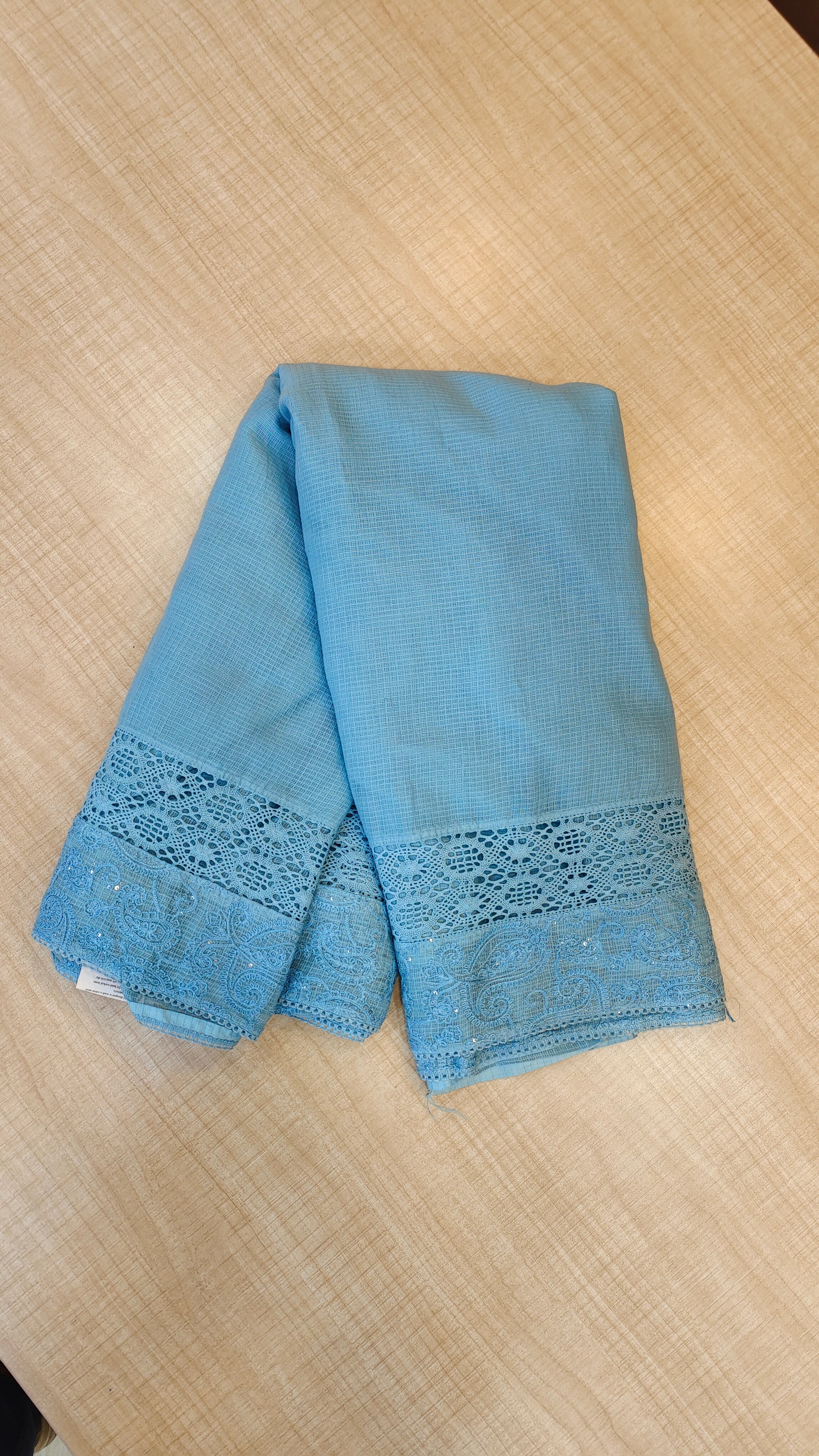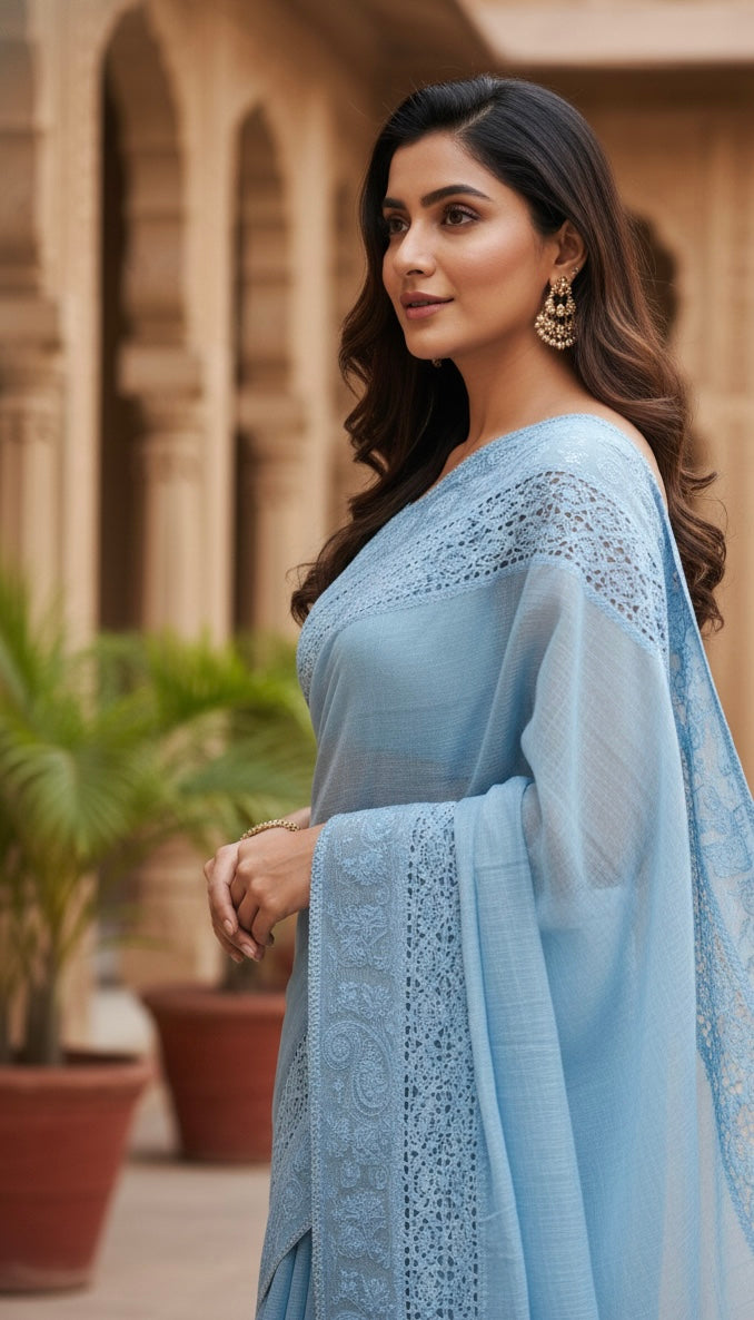 Design :Soft pastel blue saree with a very elegent,feminine look.Features lace panels with cutwork (jaali-style )detailing.Floral embroidery along the border and pallu area.Subtle sequin highlights that add a gentle shimmer without being heavy .overall design is delicate ,graceful,and understand.