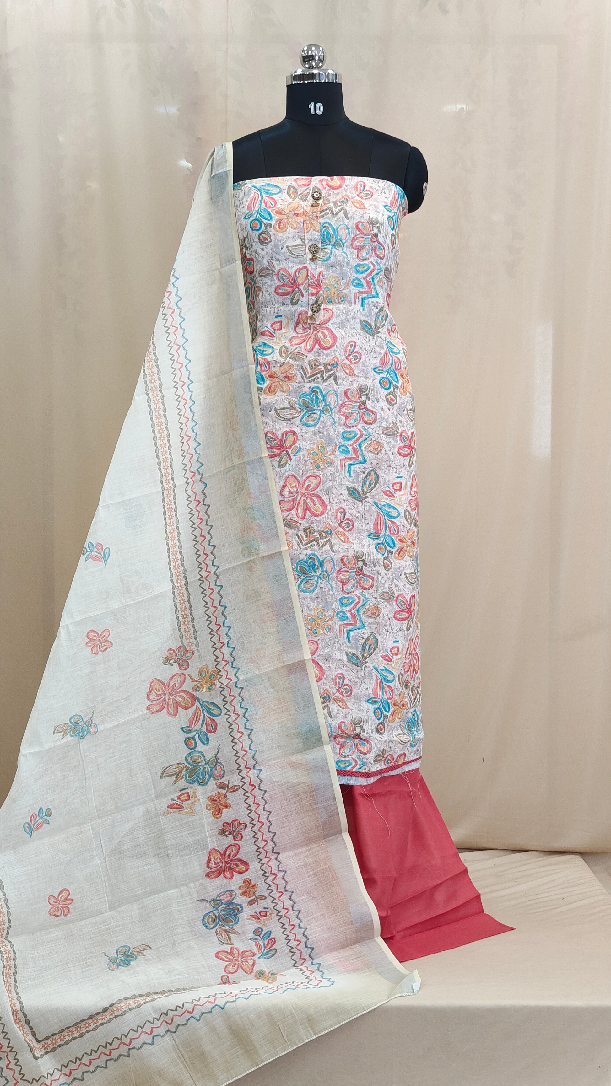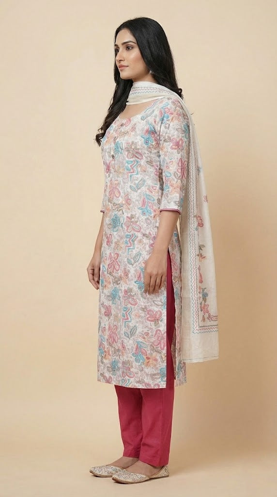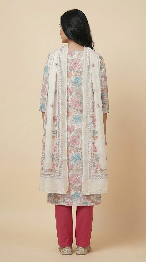 Dupatta : Paired with a linen dupatta adorned with matching floral prints this outfit blends comfort with charm.