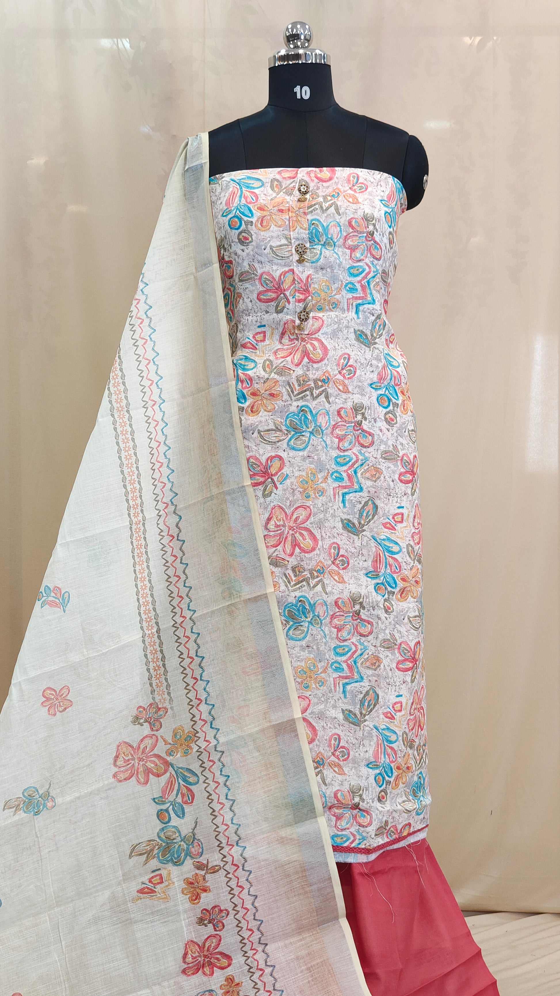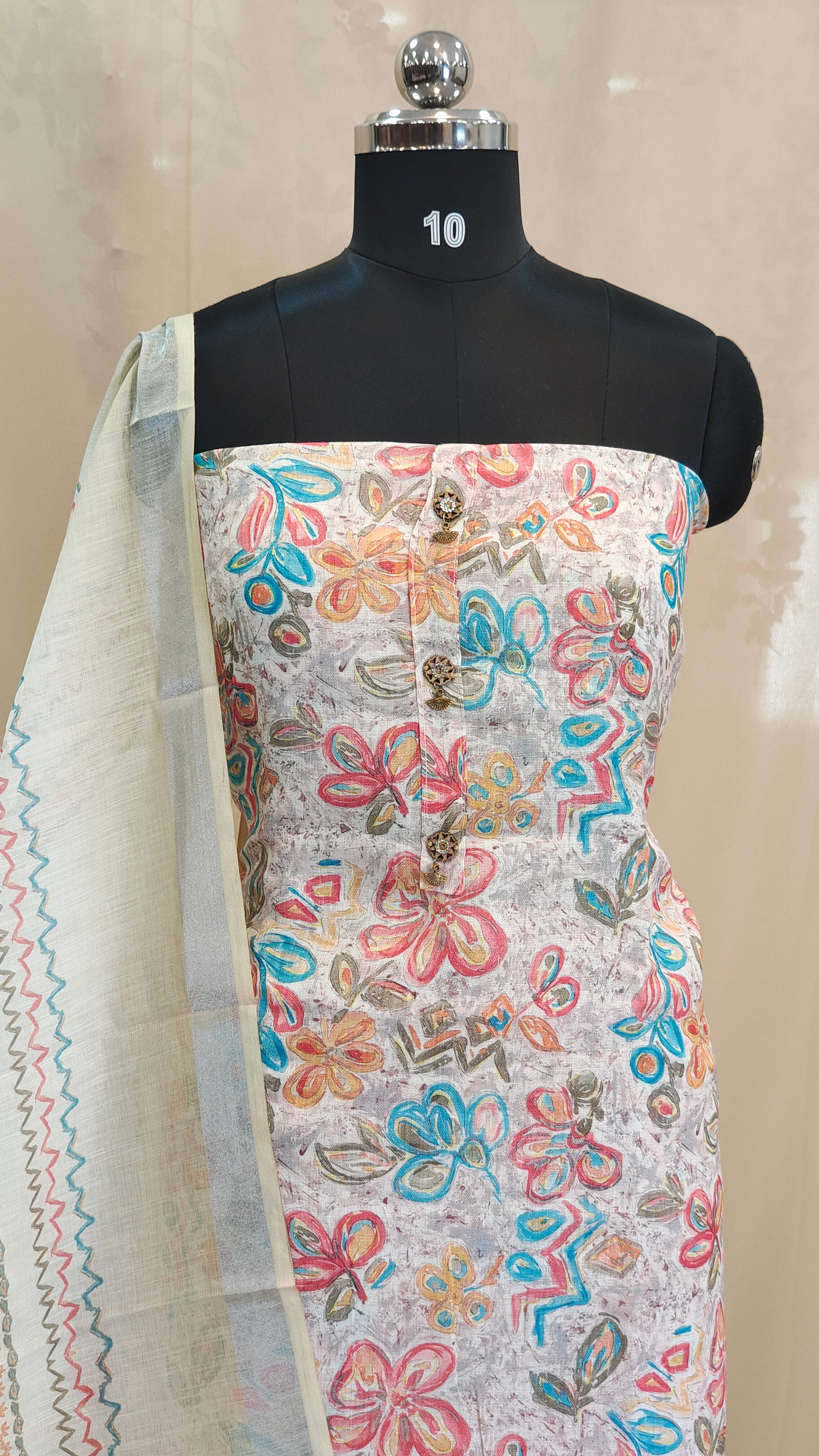 Design : This elegant linen cotton salwar set features a full body floral print design giving it a soft and graceful appeal. The yoke is highlighted with an antique metal gold pendant adding a touch of sophistication.