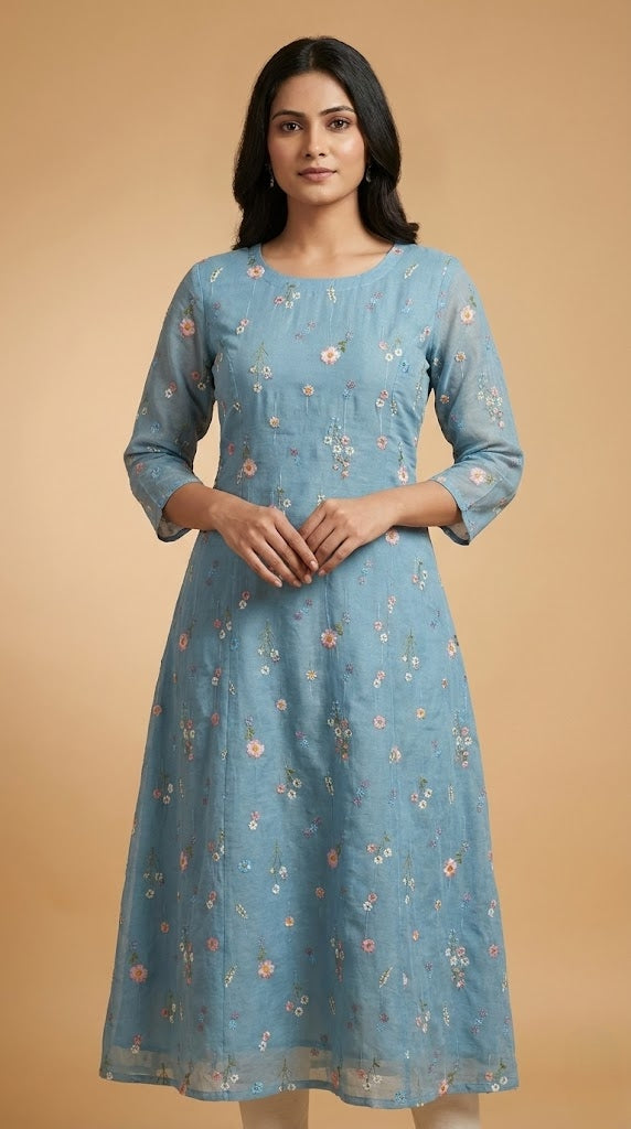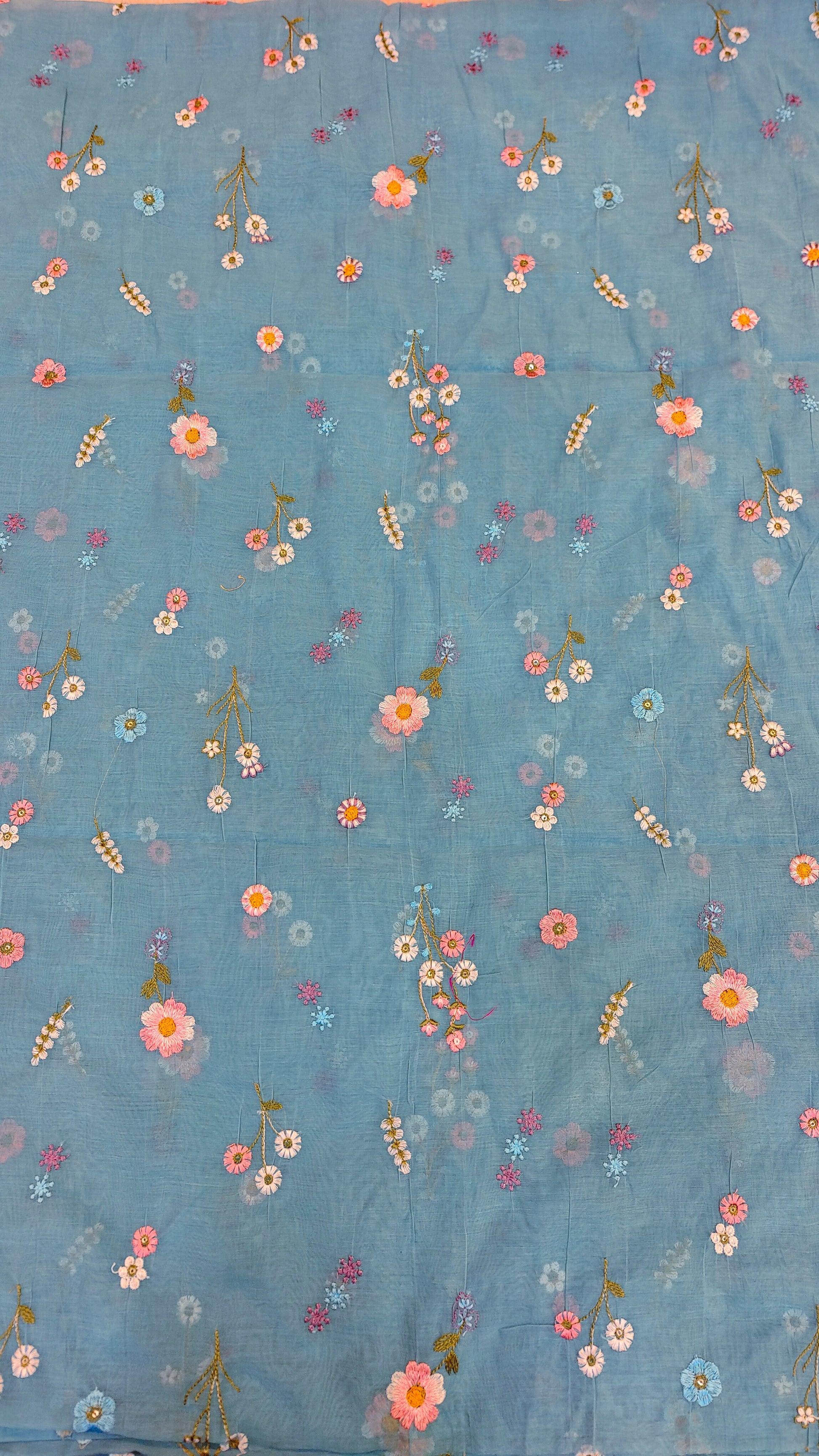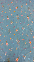 This elegant mul chanderi running material comes in a refreshing blue shade highlighted with delicate floral embroidery scattered evenly across the fabric.