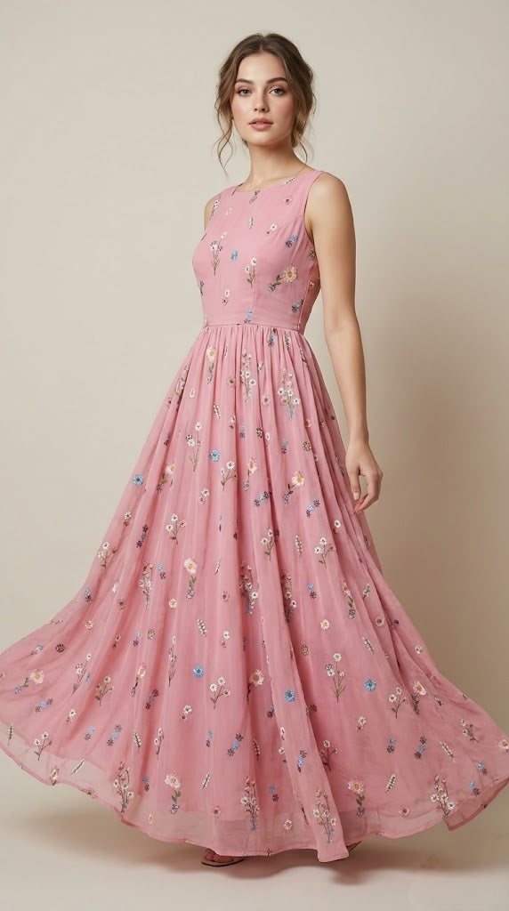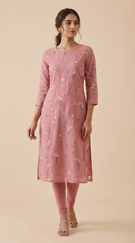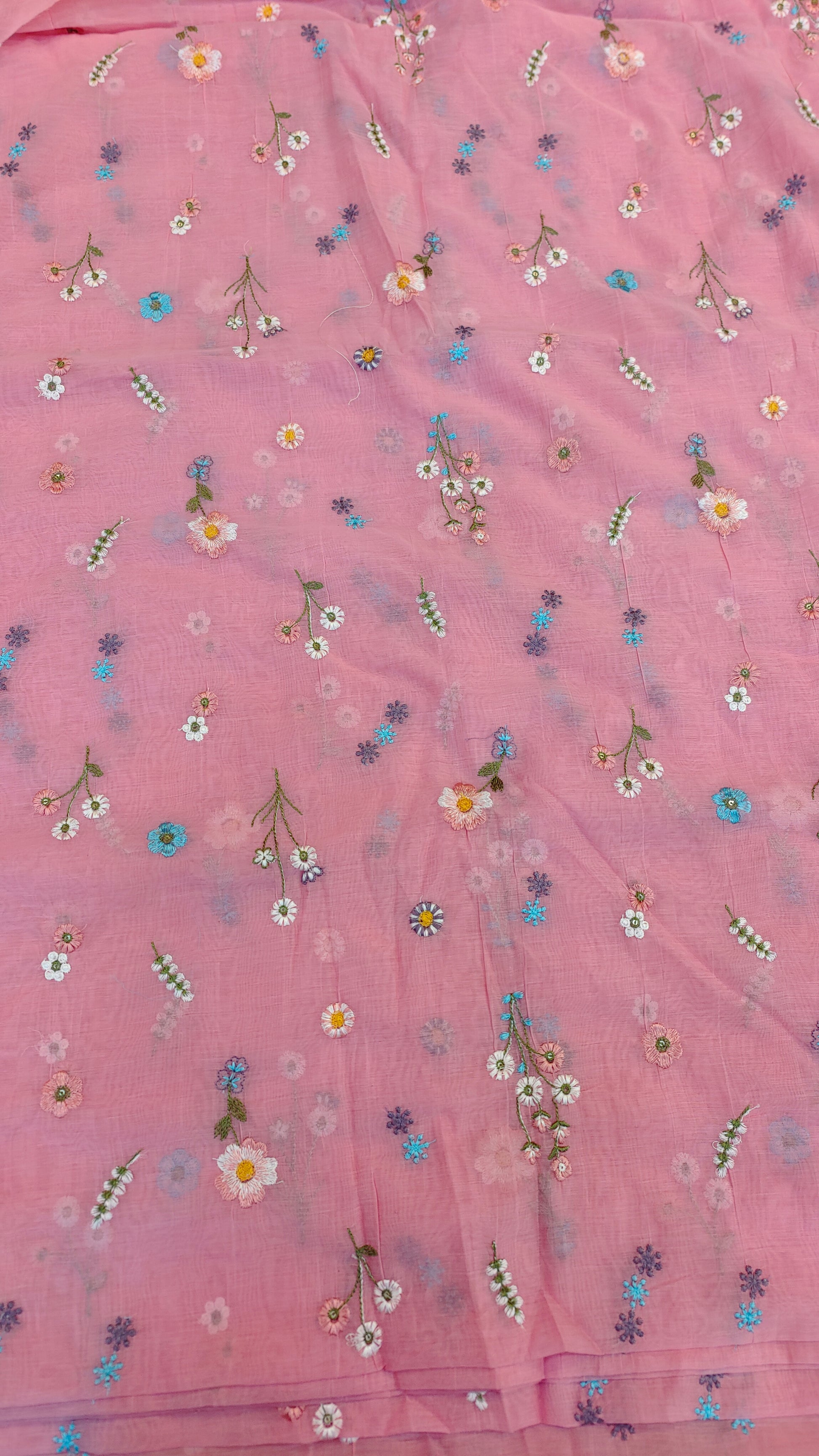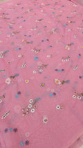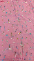 This elegant mul chanderi running material comes in a refreshing pink shade highlighted with delicate floral embroidery scattered evenly across the fabric.