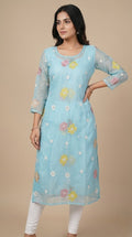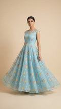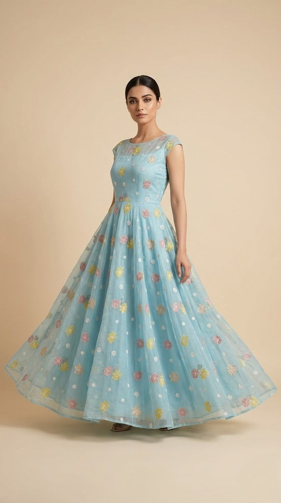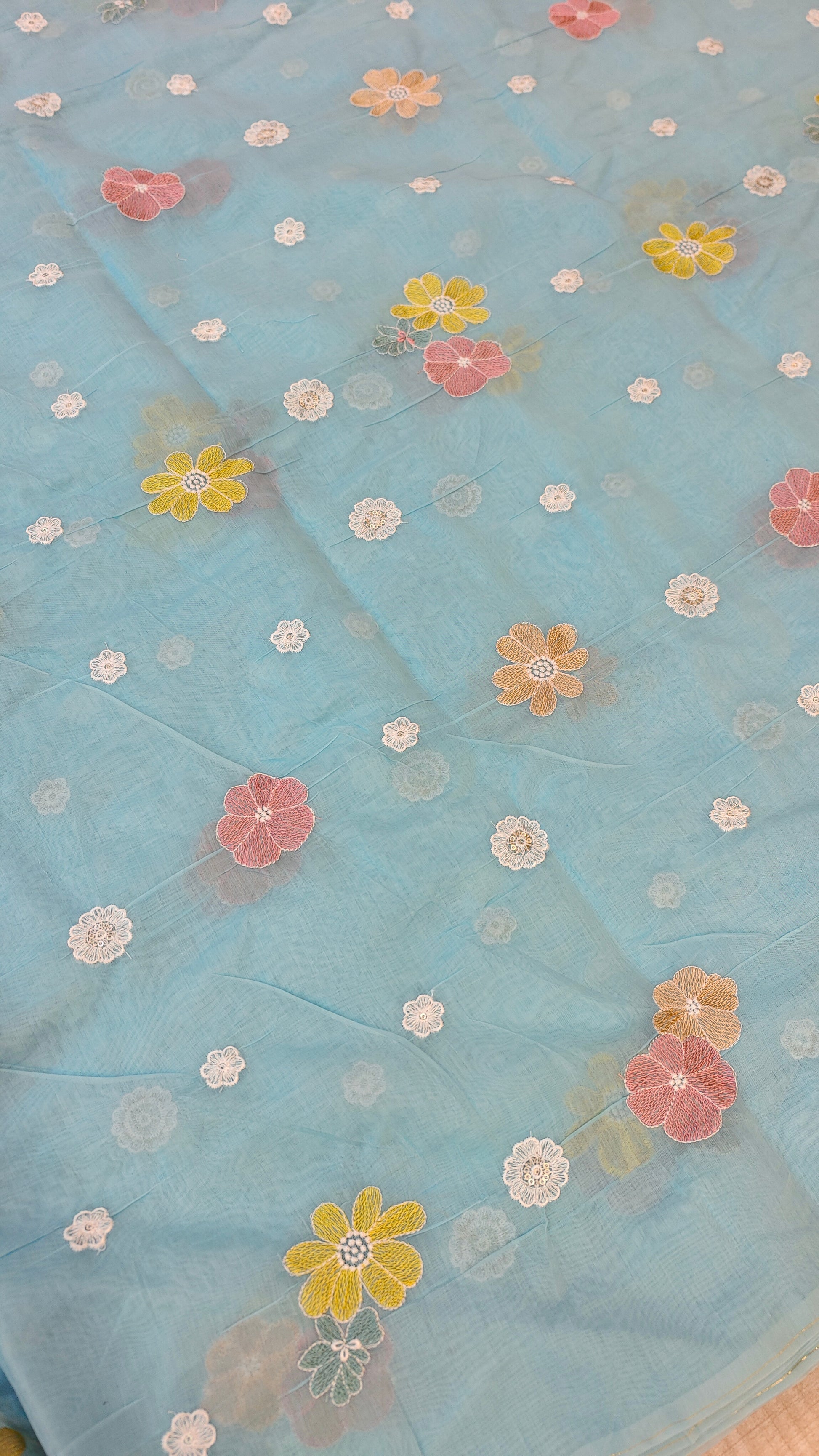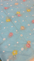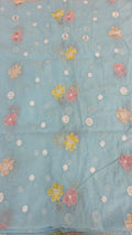 This elegant mul chanderi running material comes in a refreshing powder blue shade highlighted with delicate floral embroidery scattered evenly across the fabric.