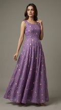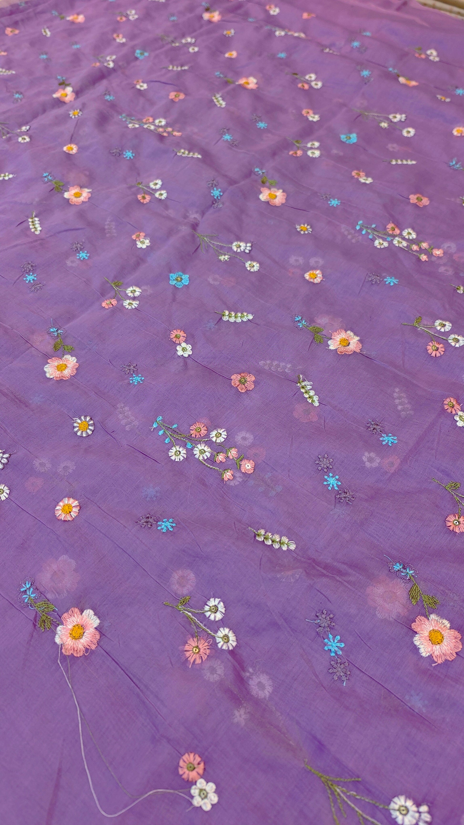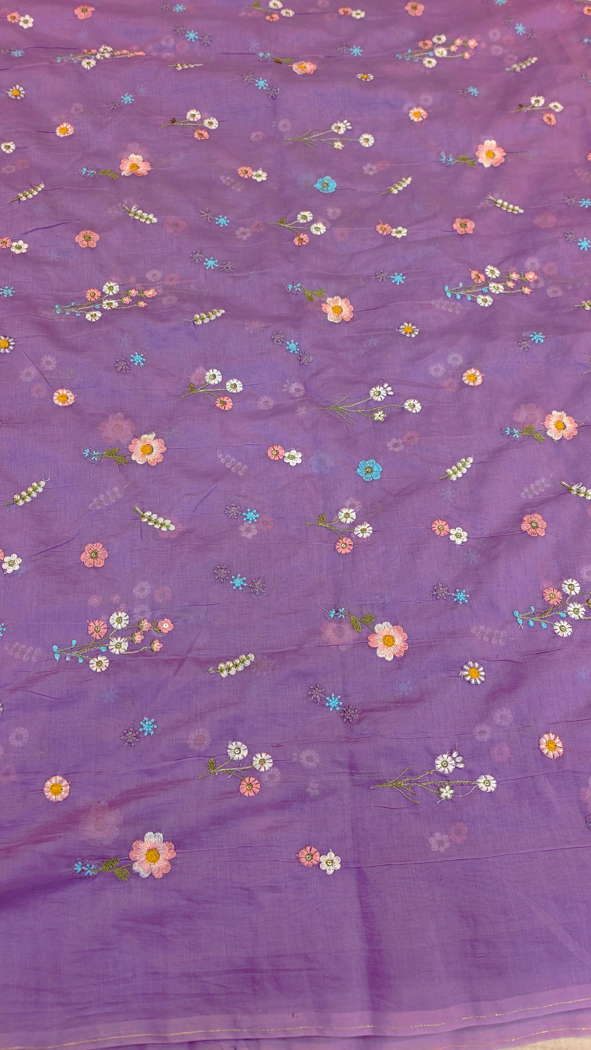 This elegant mul chanderi running material comes in a refreshing lavender shade highlighted with delicate floral embroidery scattered evenly across the fabric.