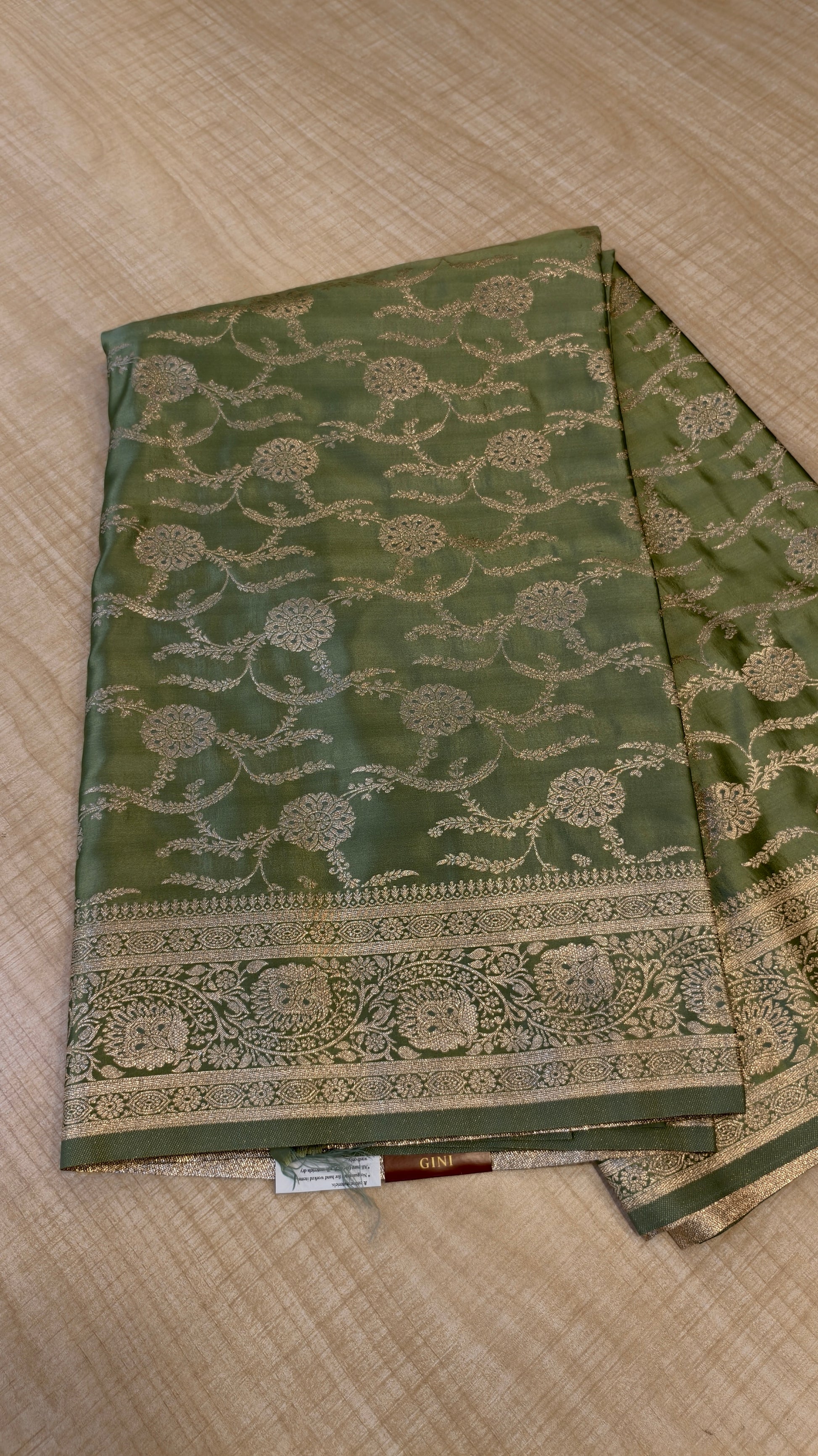 Mushru silk saree with water gold zari. Saree is attached with butta woven blouse piece.