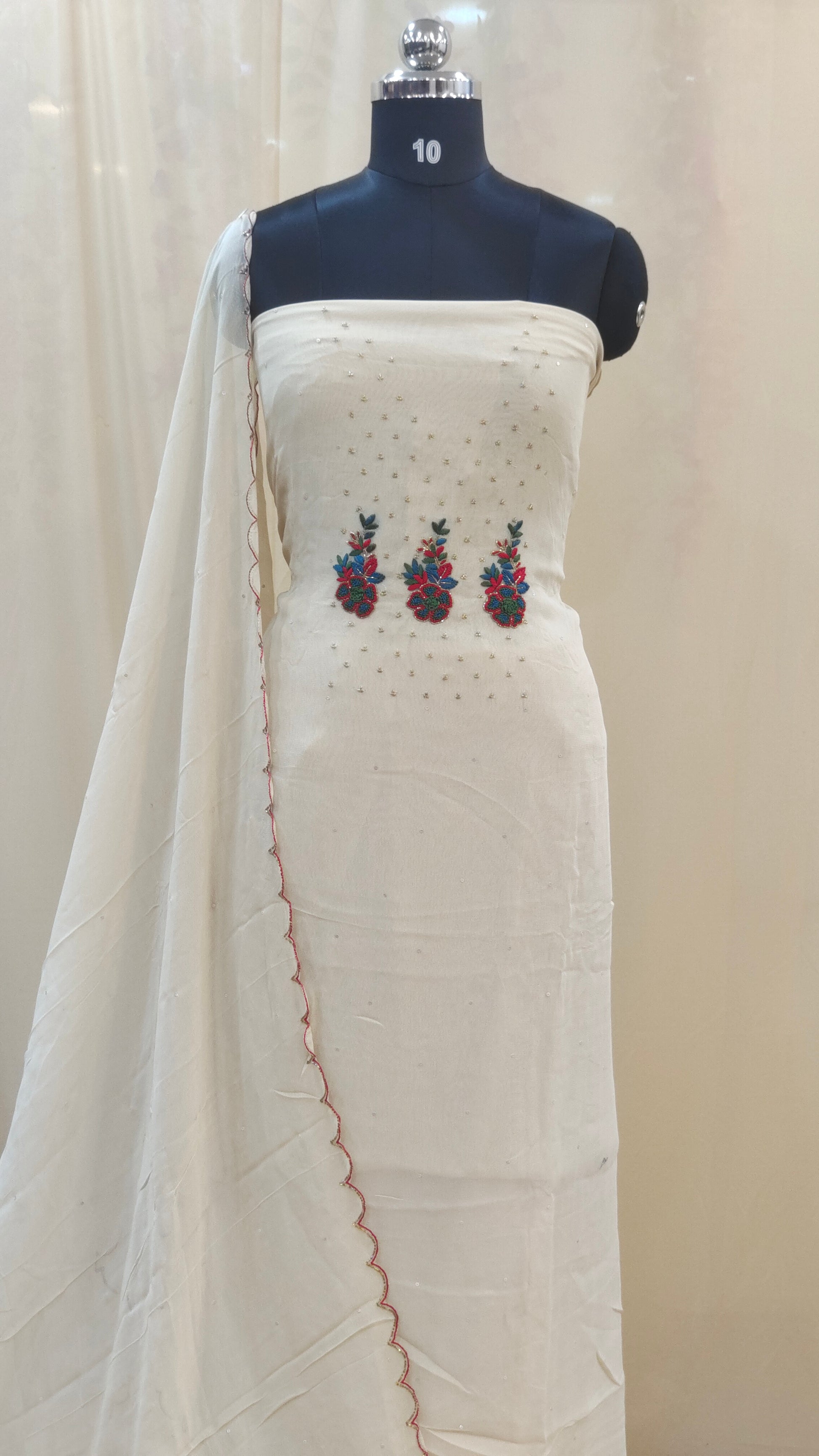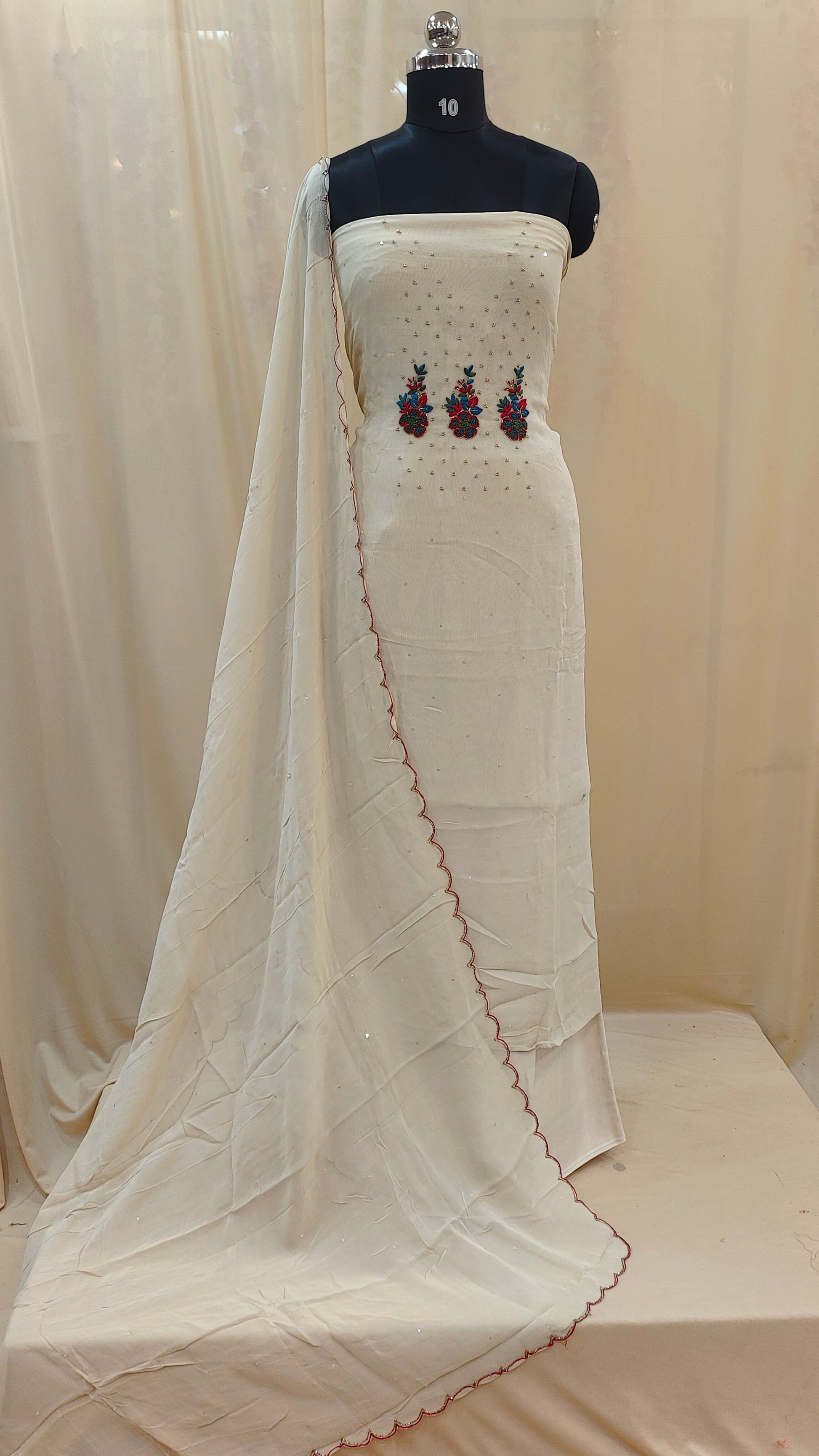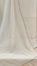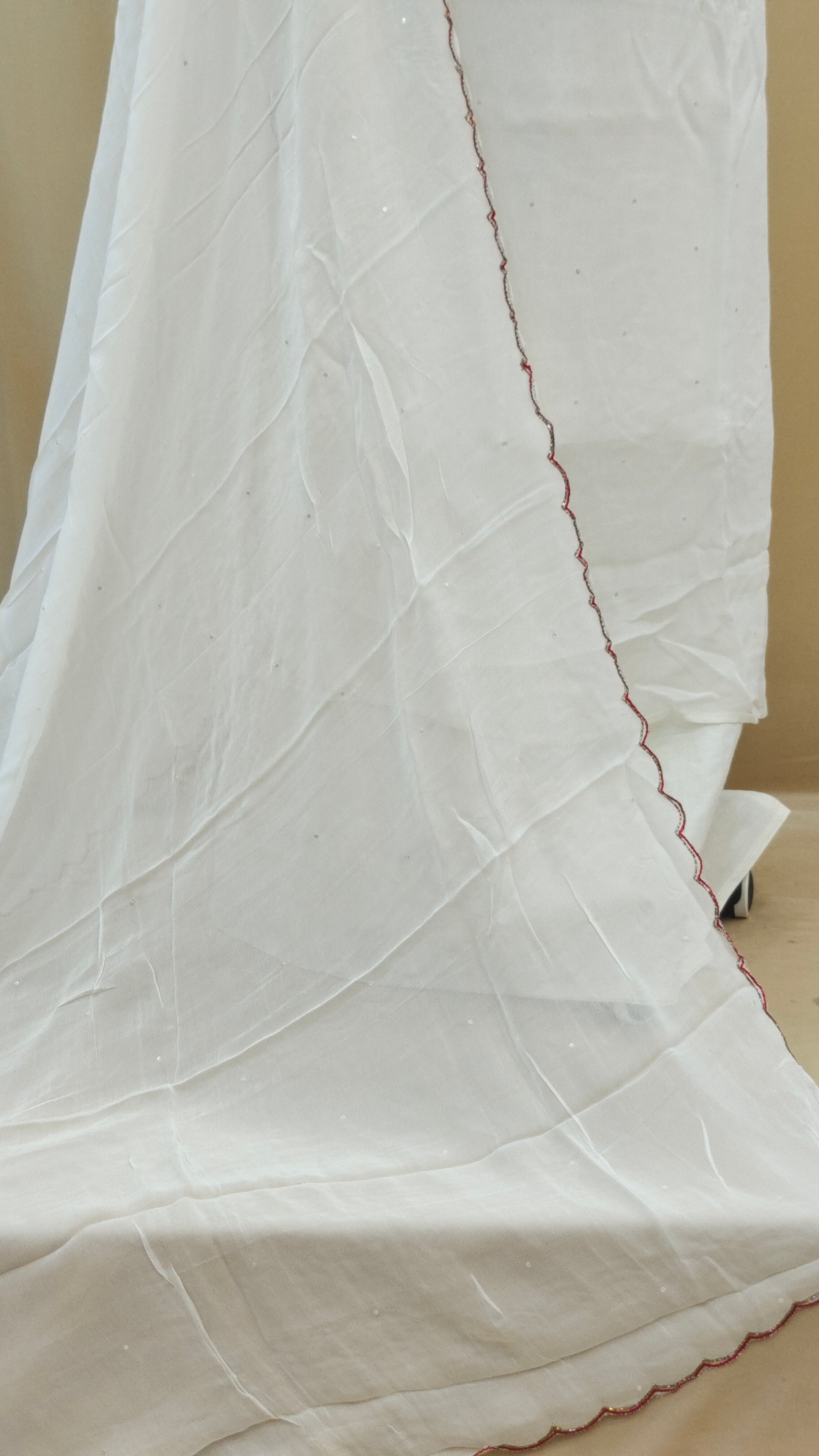 * Dupatta highlighted with scalloped edges enhanced using red thread work and bead embellishements