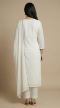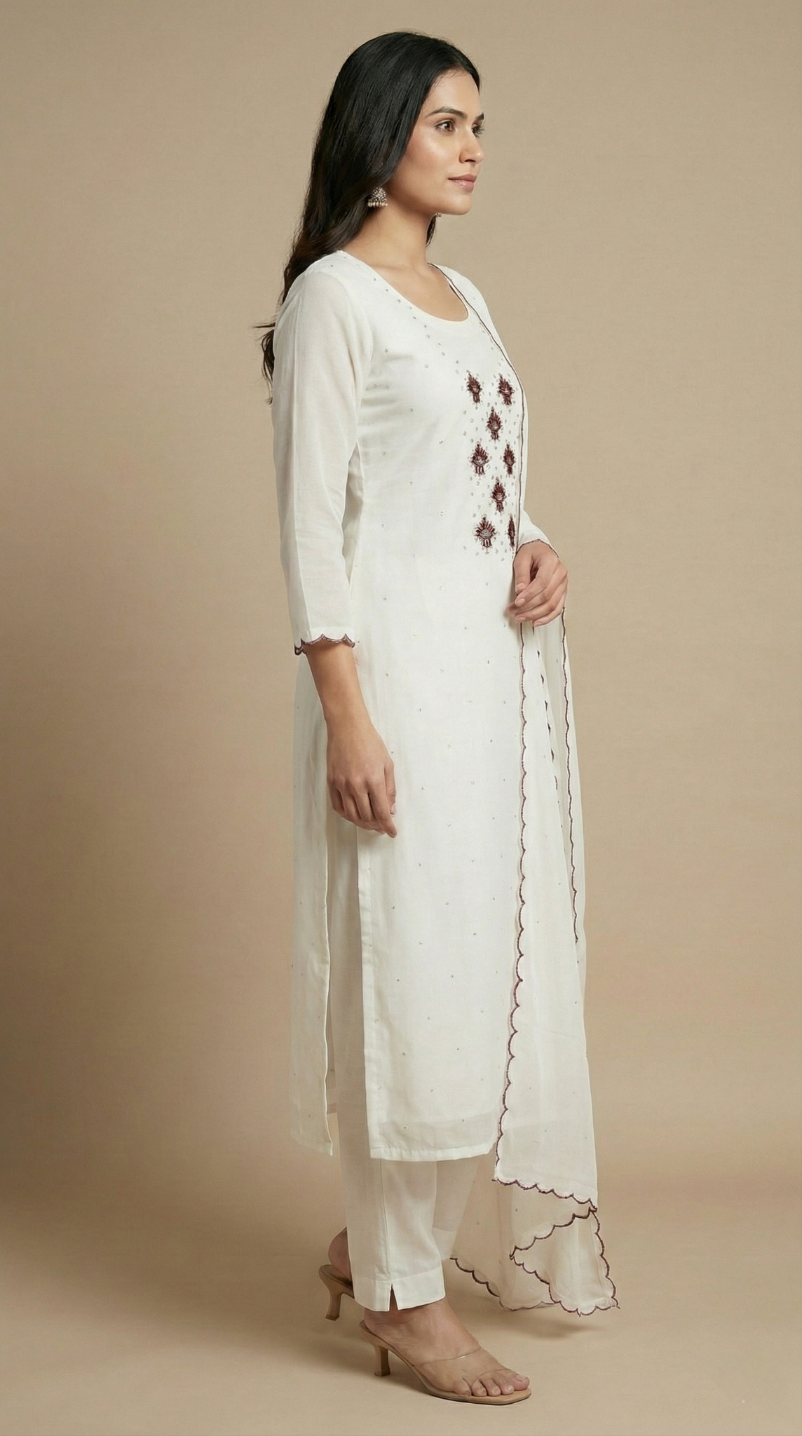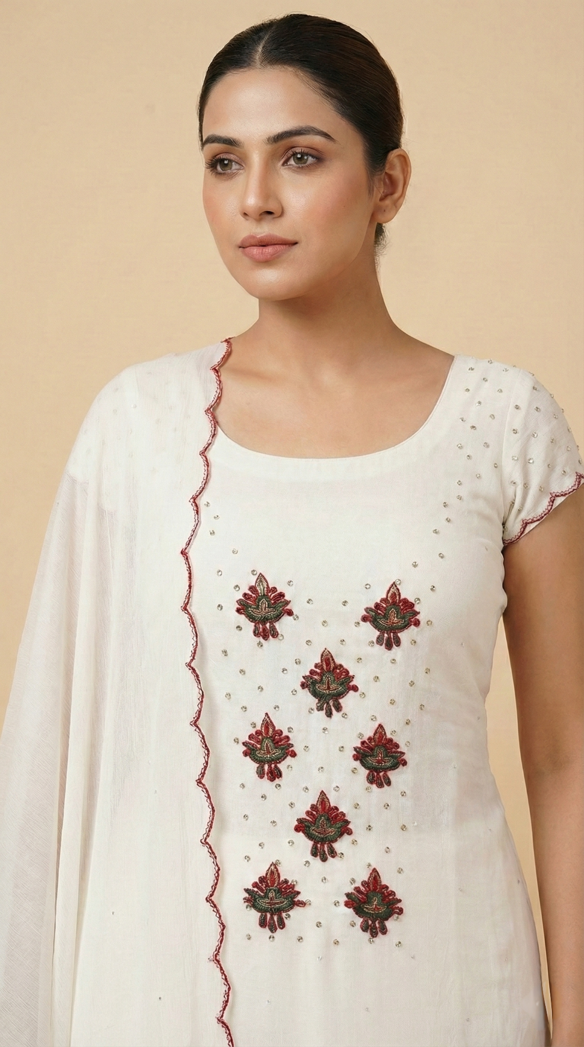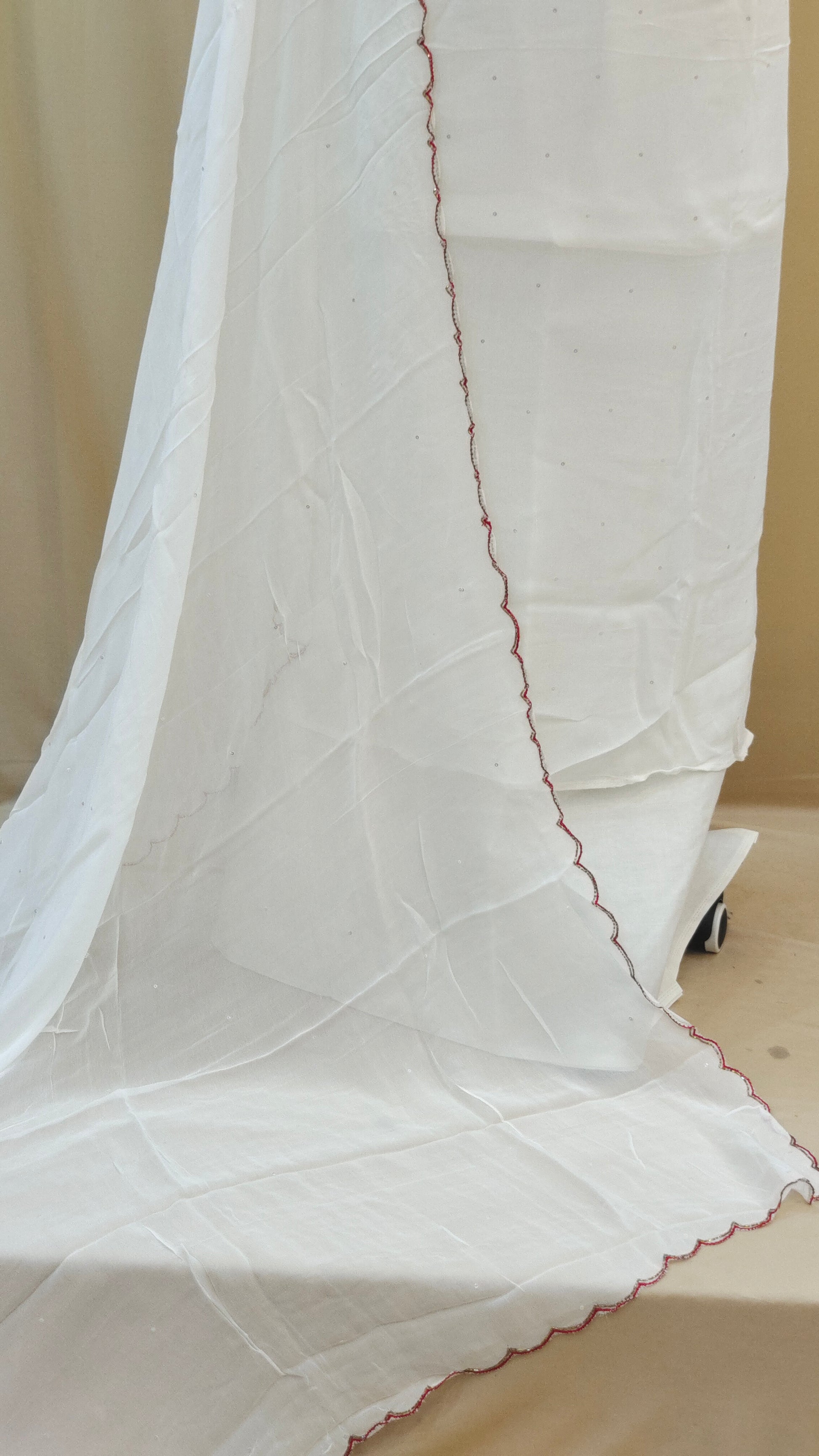 * Dupatta highlighted with scalloped edges enhanced using red thread work and bead embellishements