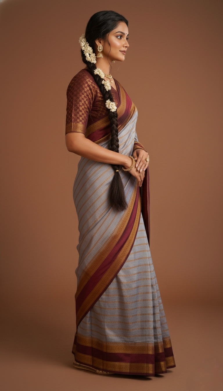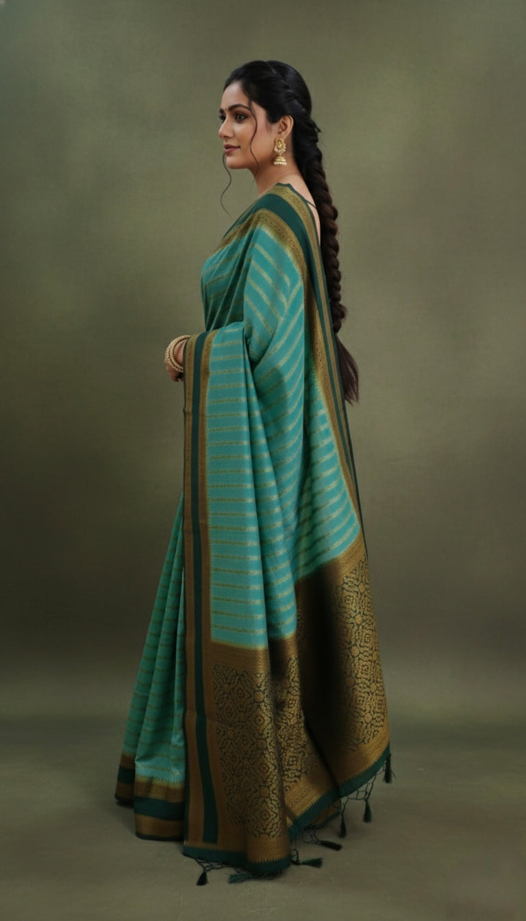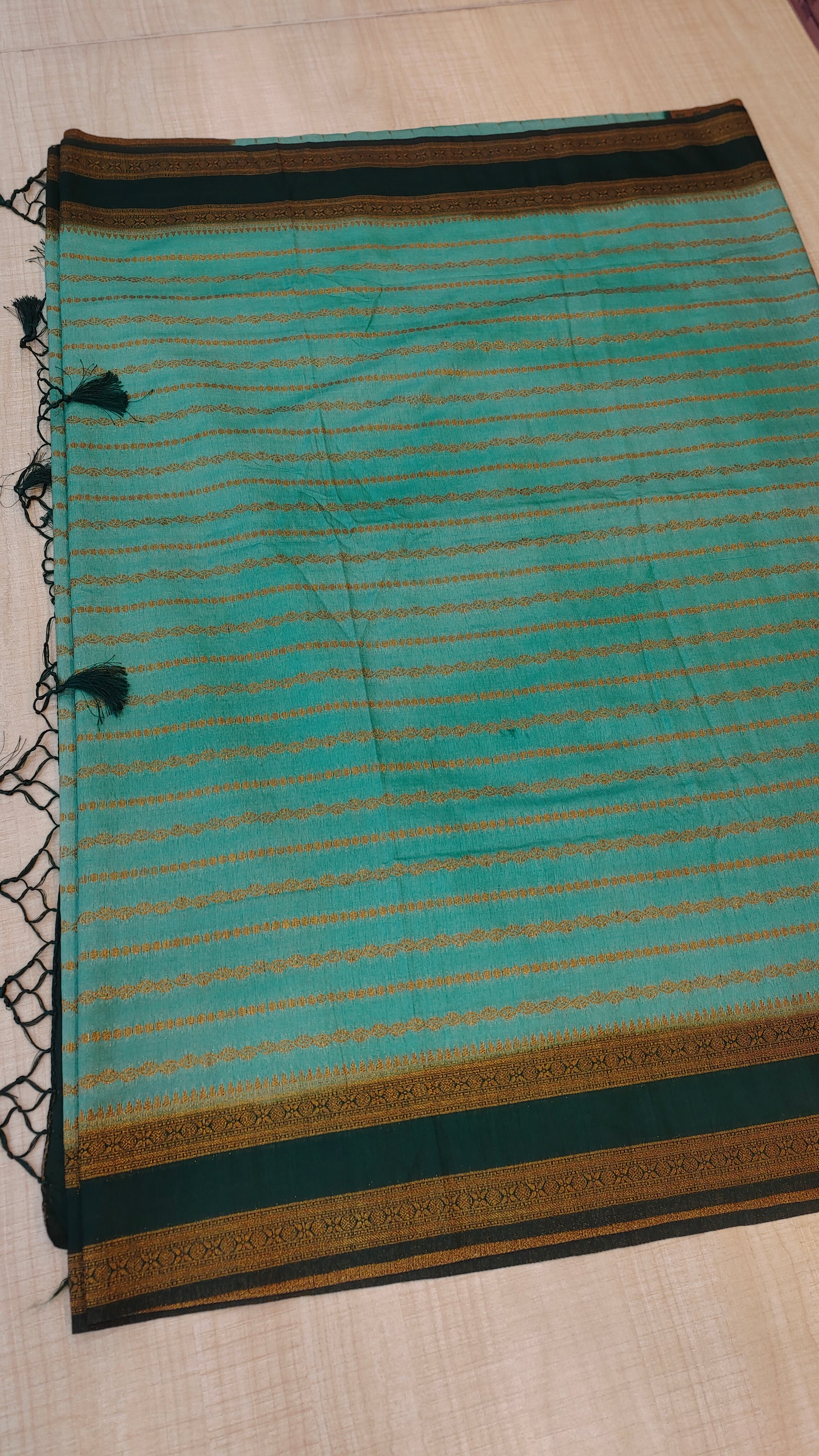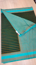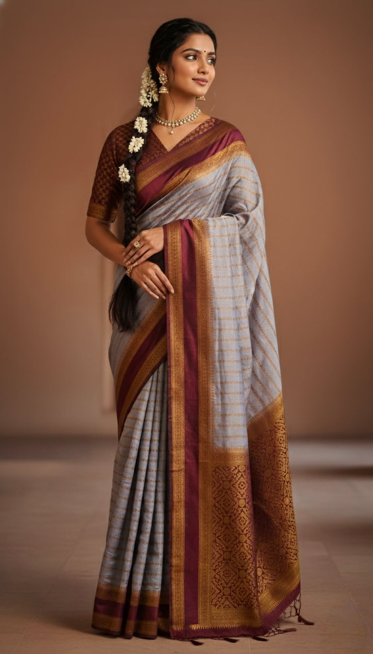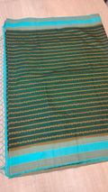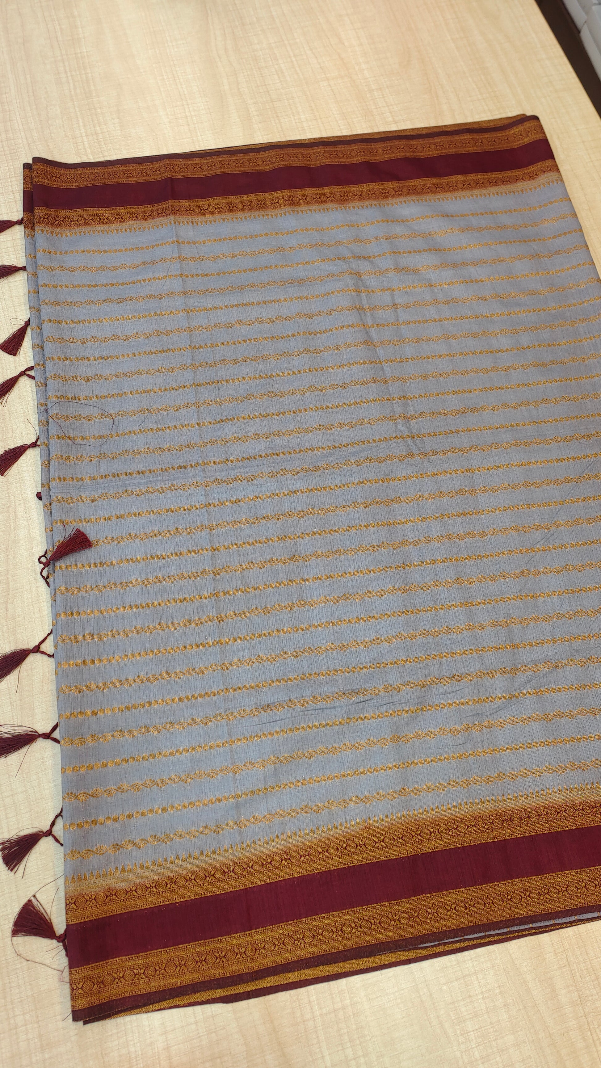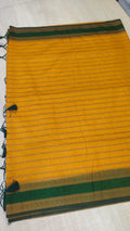 Design : The saree features elegant vertical zari stripes woven in gold giving it graceful and refined look.