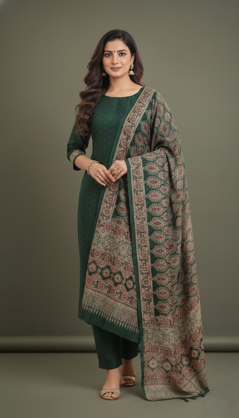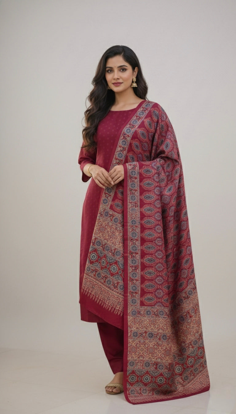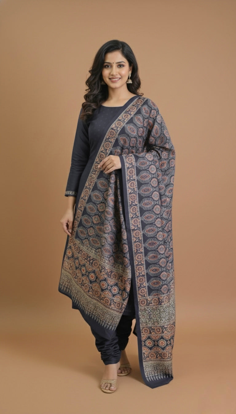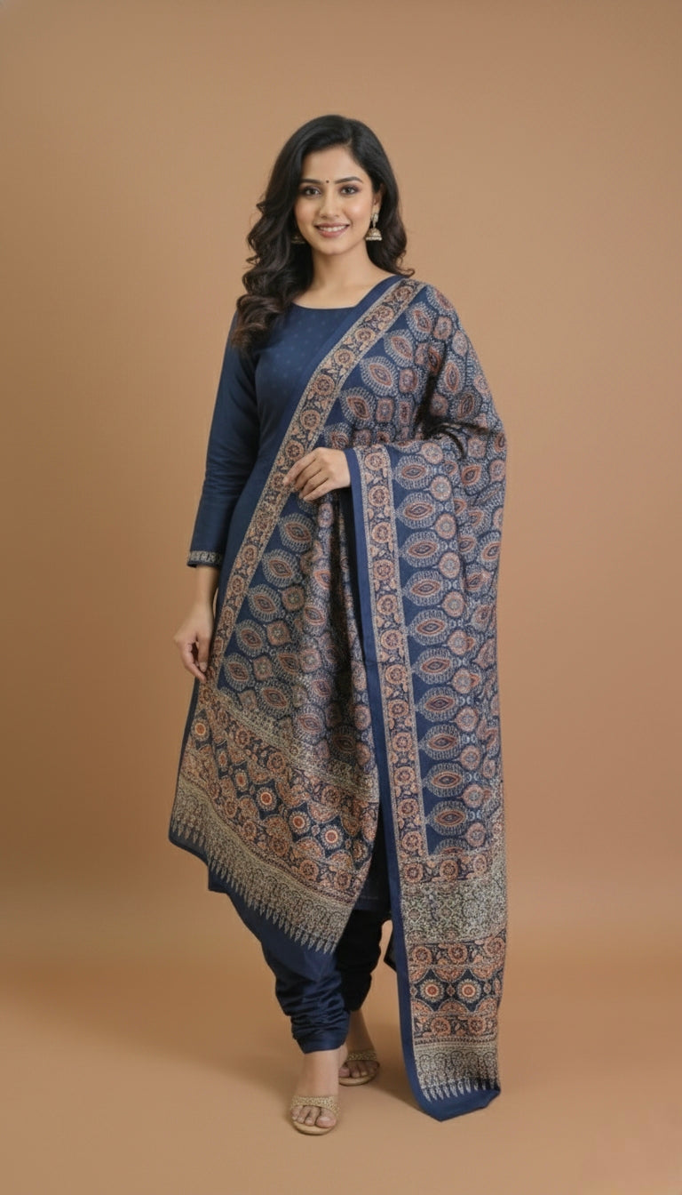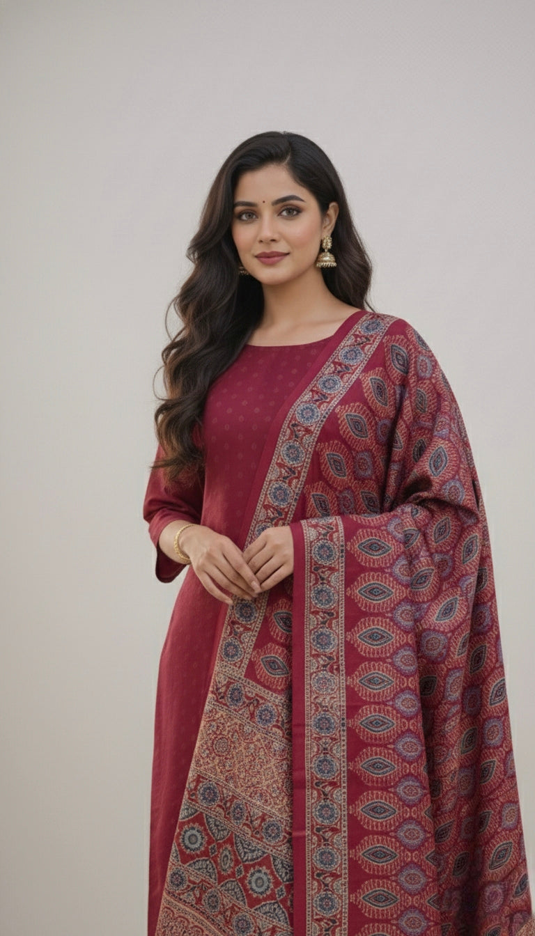 Dupatta : The dupatta features a beautiful ajrak print pattern enhancing its overall charm.