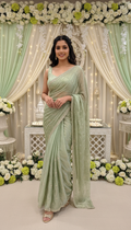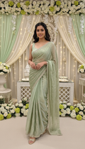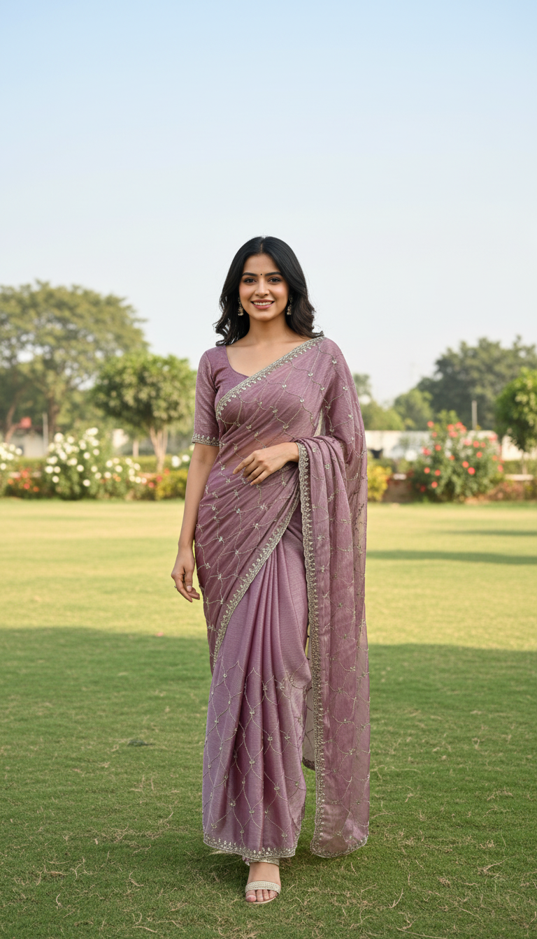 Blouse : The saree comes with an attached plain blouse, beautifully highlighted with beads and stone work at the sleev ends for a refined finishing touch. (The model has paired the saree with a different blouse for styling purpose)